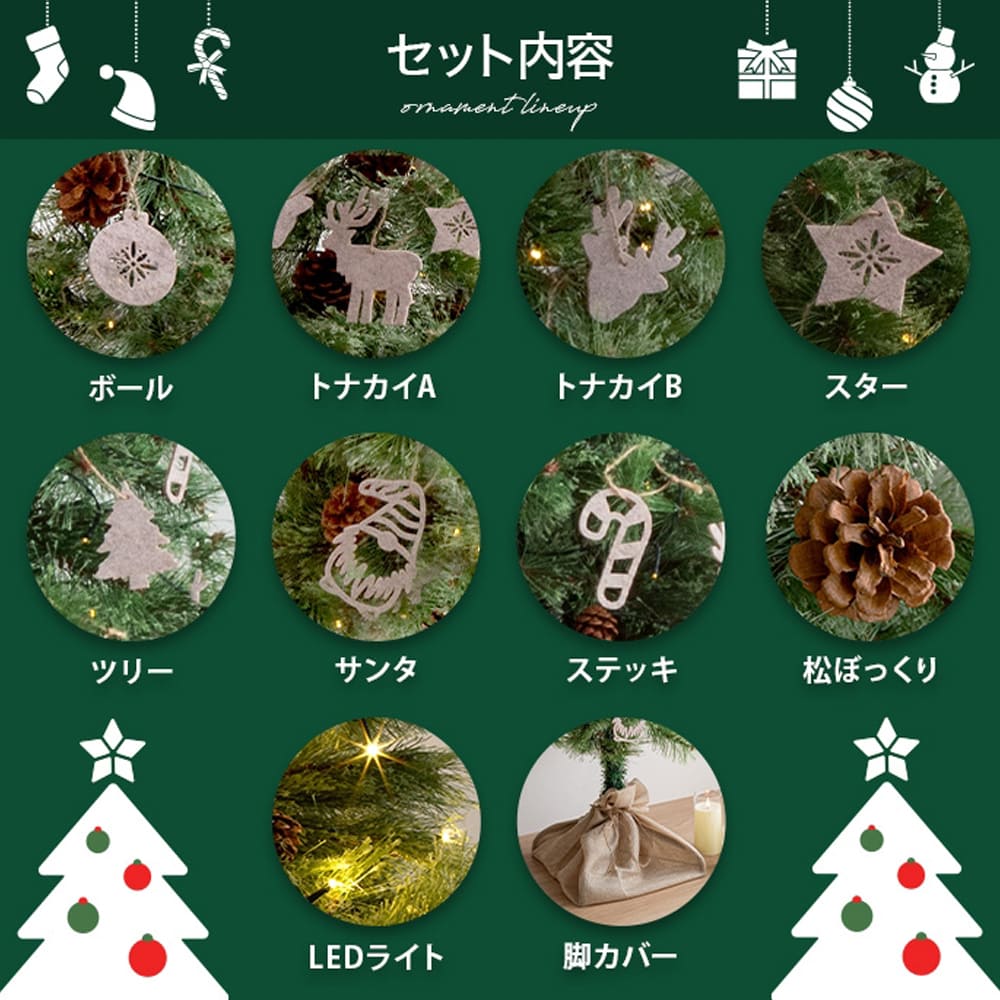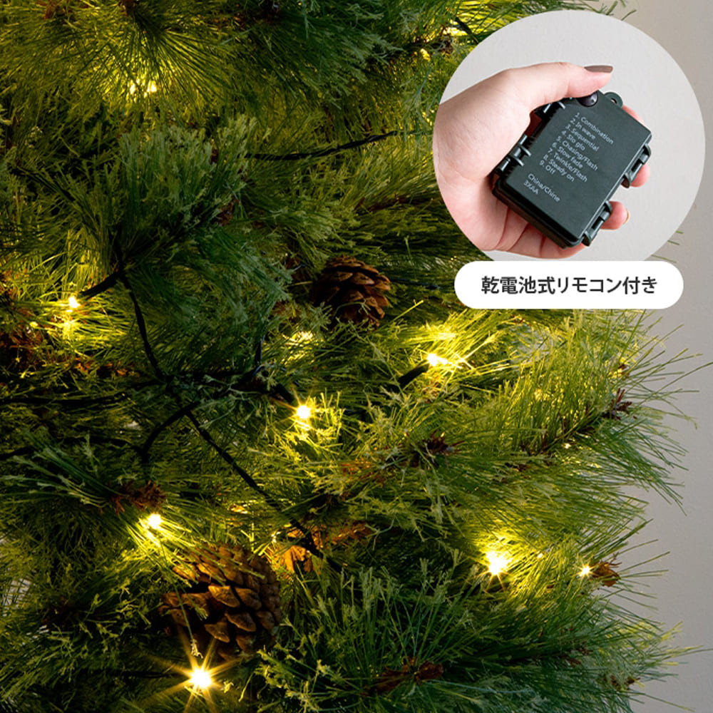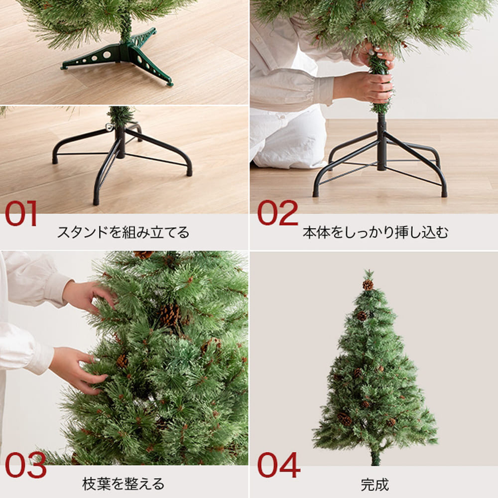 | 備考 | ■組立品 ■付属品 ・松ぼっくり10個 ・LEDライト1セット(電球の数:30個) ・脚カバー1セット ※単三乾電池を3本ご用意ください。 ※組み立て時間:1人約15分(飾り付け時間除く) ※組み立て工具不要。 ※商品の色味に関してましては、できる限り実物に近くなる様に努めておりますが、ご利用のモニターやデバイスの発色によりまして、実物と異なって見える場合がございます。 |