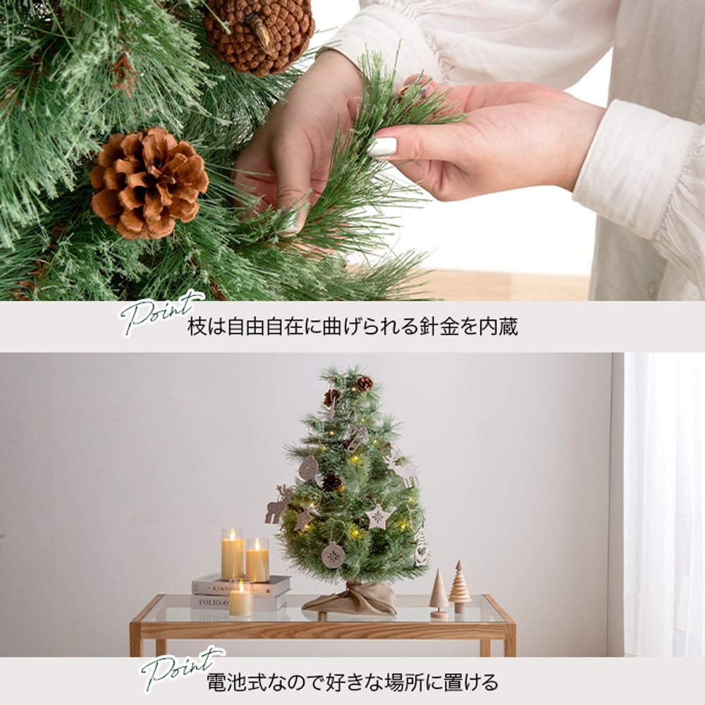 ツリーには、柔らかく光るLEDライトと本物の松ぼっくりをセット。