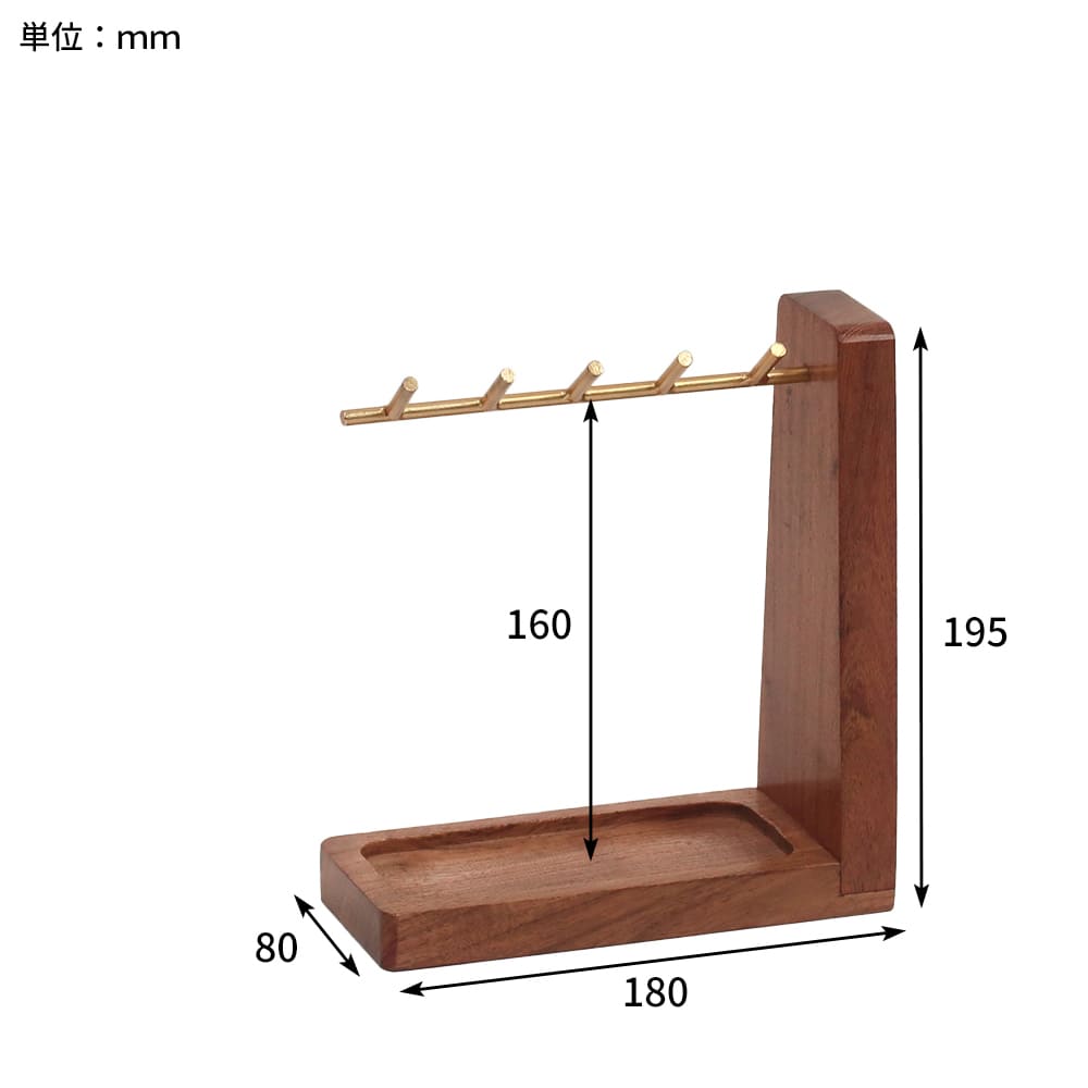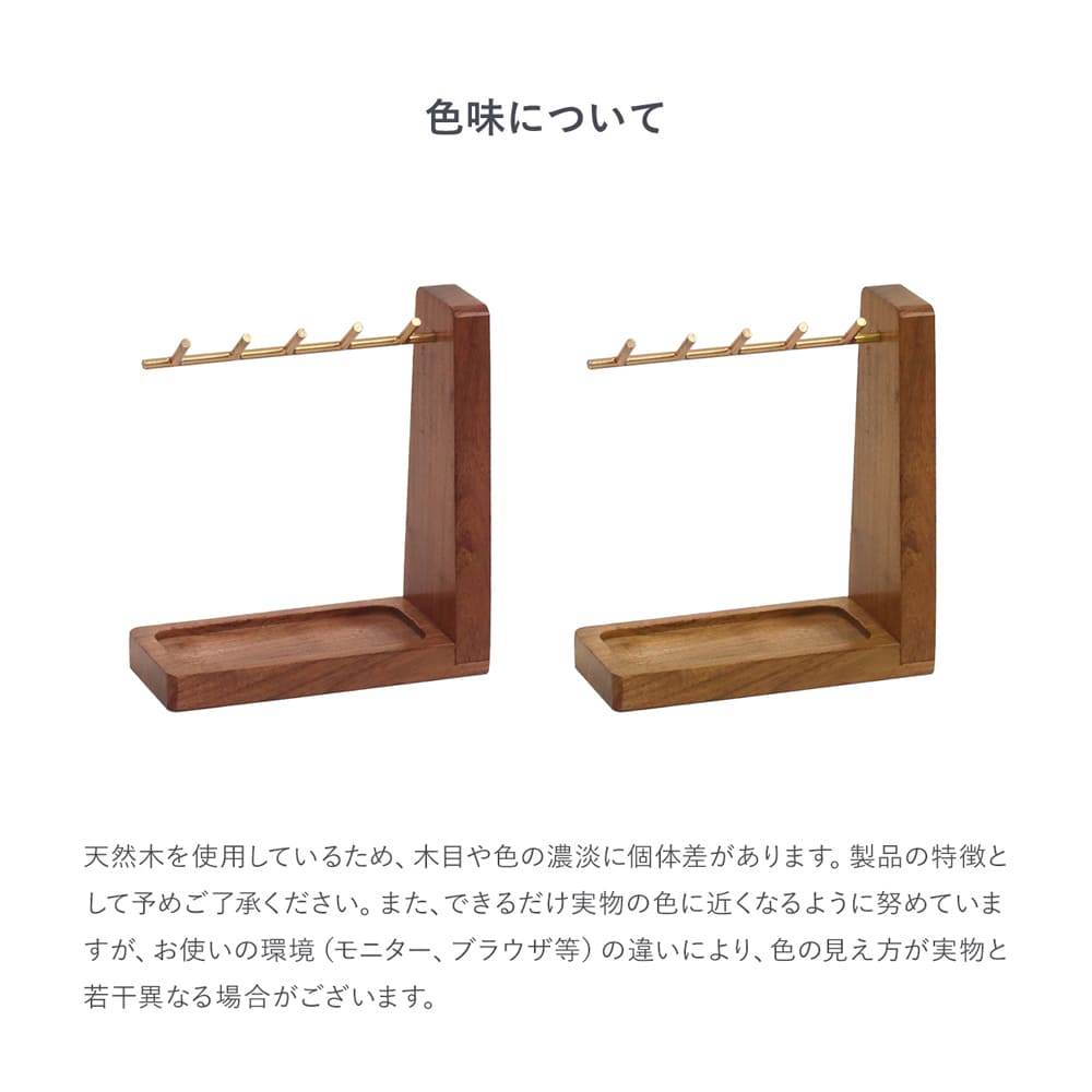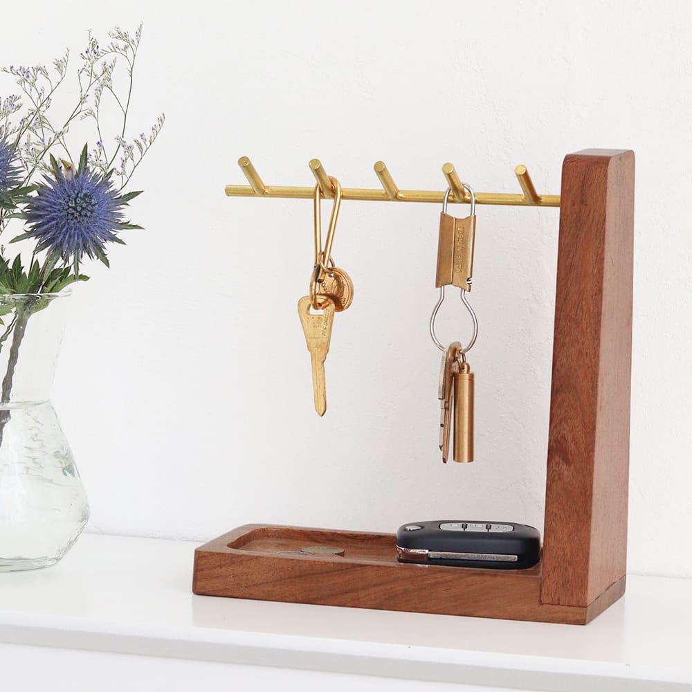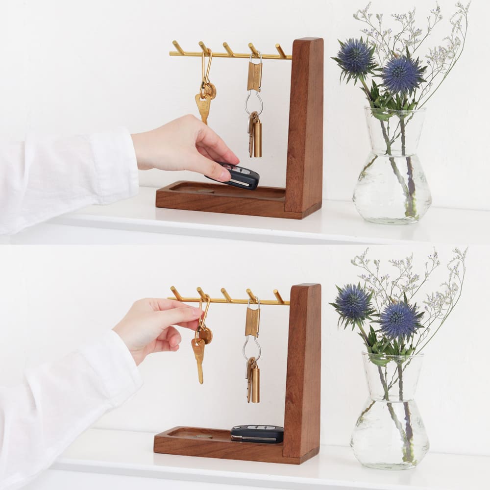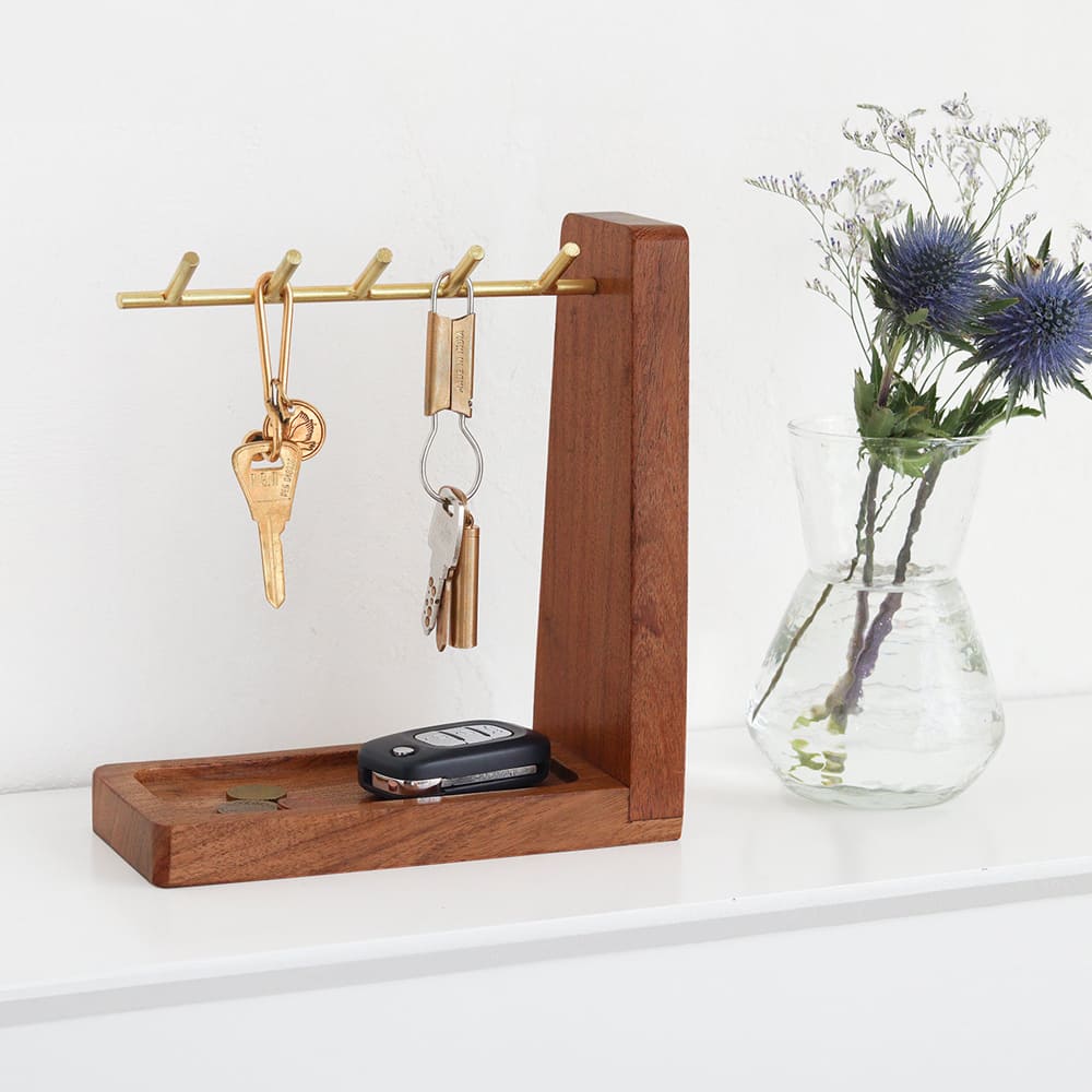 アカシアの木目とゴールドが馴染み、インテリアとしても楽しめるキースタンドです。