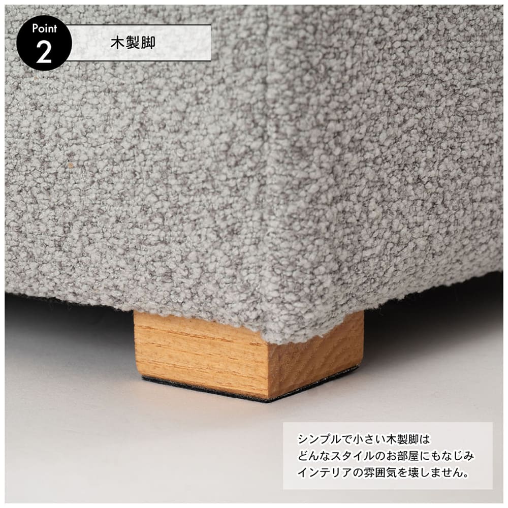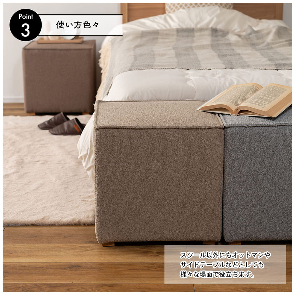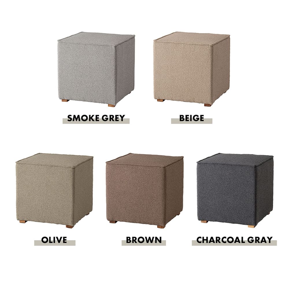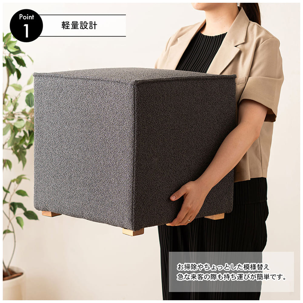 ころんと可愛いキューブ型フォルムと、落ち着いたニュアンスカラーが魅力のスツール。置くだけでお部屋がやさしい雰囲気に整います。軽量設計で持ち運びも簡単。スツールとしてはもちろん、オットマンやサイドテーブルとしても活躍します。天然木アッシュ脚がナチュラルなアクセントになり、リビングや寝室など幅広いインテリアに自然になじむ万能家具です。