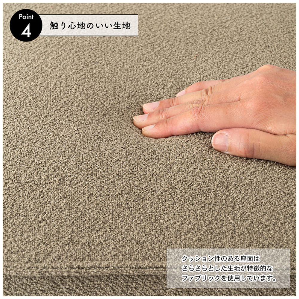 脚部には天然木アッシュ材を使用。小ぶりでシンプルな脚が、空間にあたたかみをプラスします。座面はクッション性があり、さらっとした肌ざわりのファブリック生地を採用。長時間でも心地よく座れます。デザイン性と実用性を兼ね備えた、毎日の暮らしに寄り添うインテリアスツールです。