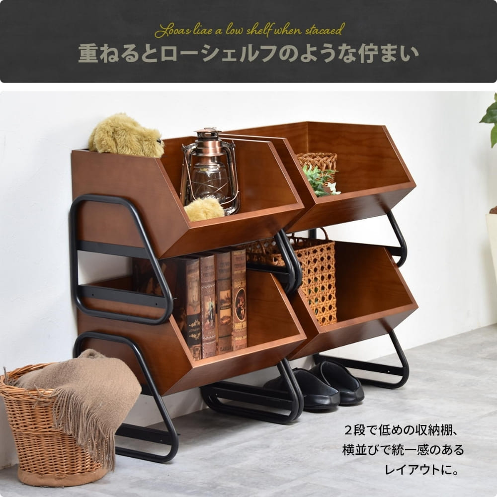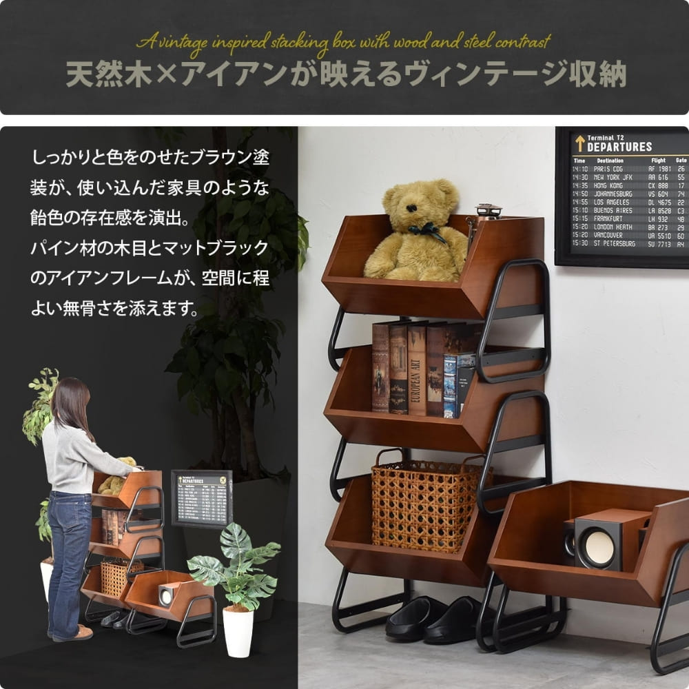 天然木のあたたかみとマットブラックのアイアンが映える、ヴィンテージ感ただようスタッキング収納ボックス。重ね方しだいでローシェルフにもなる自由なレイアウト設計です。新聞や雑誌もしっかり収まるサイズで、見せる収納を楽しめます。リビングや玄関、寝室まで幅広く使え、インテリアとしても主役になる存在感のある収納家具です。
