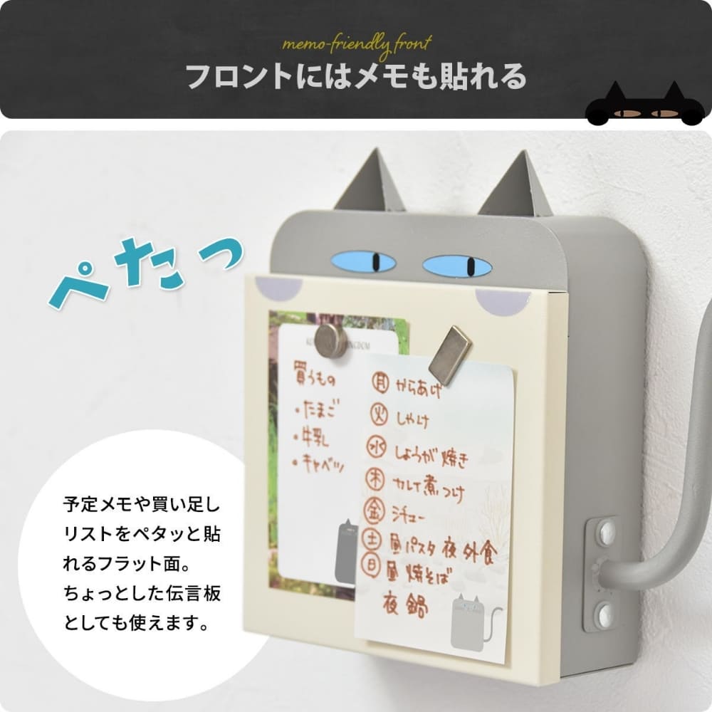 さらに、横に付いたしっぽフックには折りたたみ傘やエコバッグを掛けられます。耐荷重は約1kgで、日常使いに十分な強さです。前面はメモを貼れるフラット仕様なので、買い物リストや予定表もペタッと貼れます。ガルバナイズドスチールを使用し、サビに強く長持ち。かわいさと実用性を両立した、玄関収納におすすめのインテリアアイテムです。