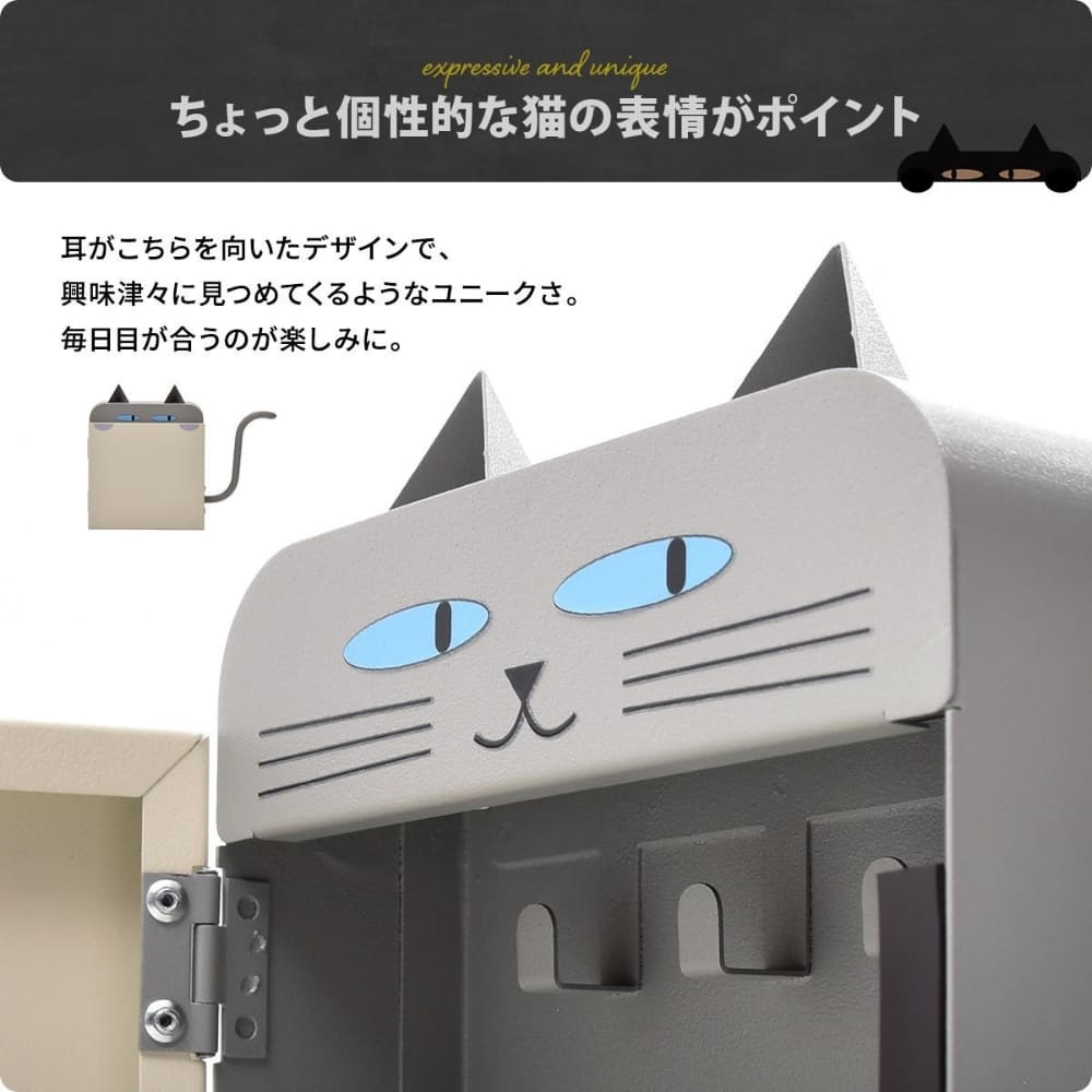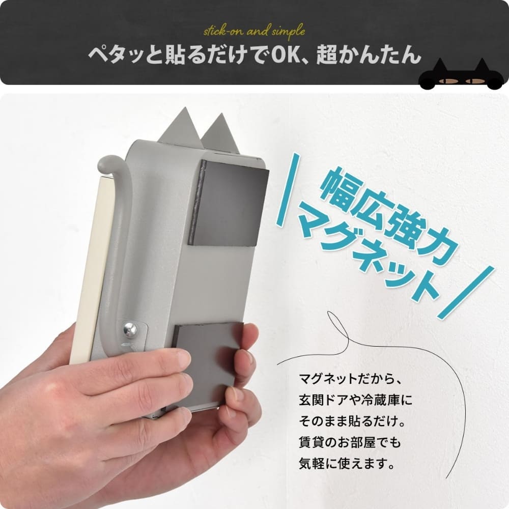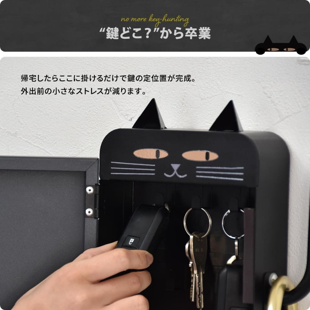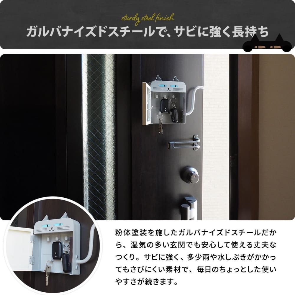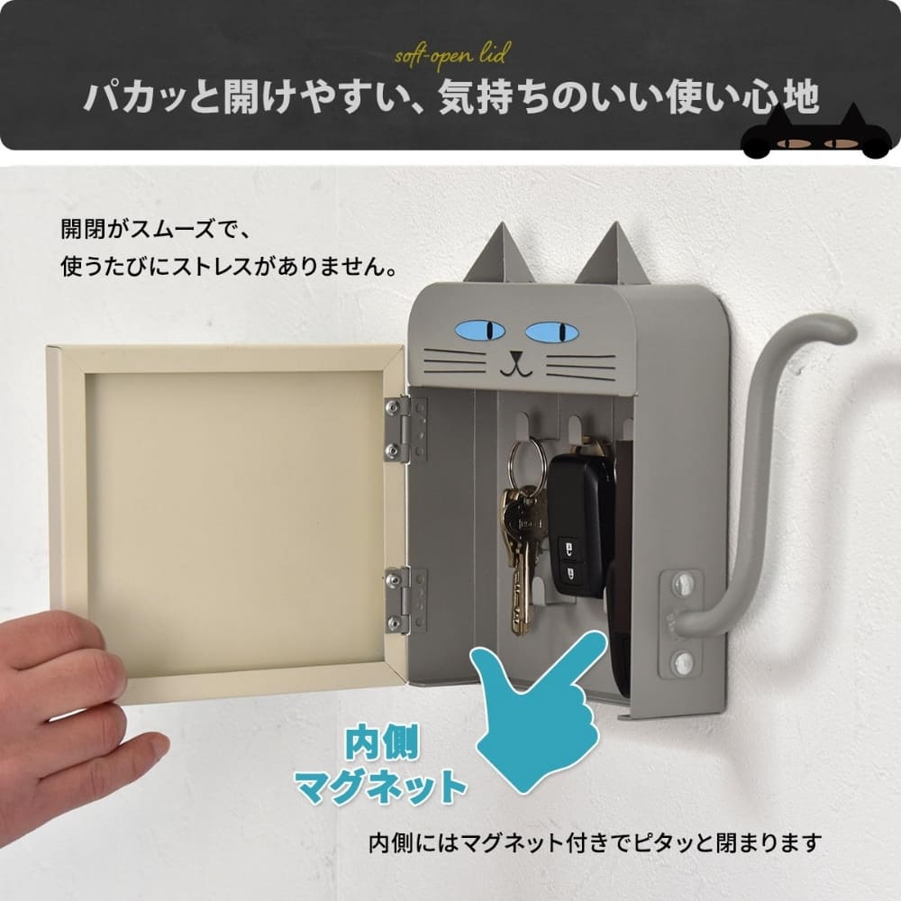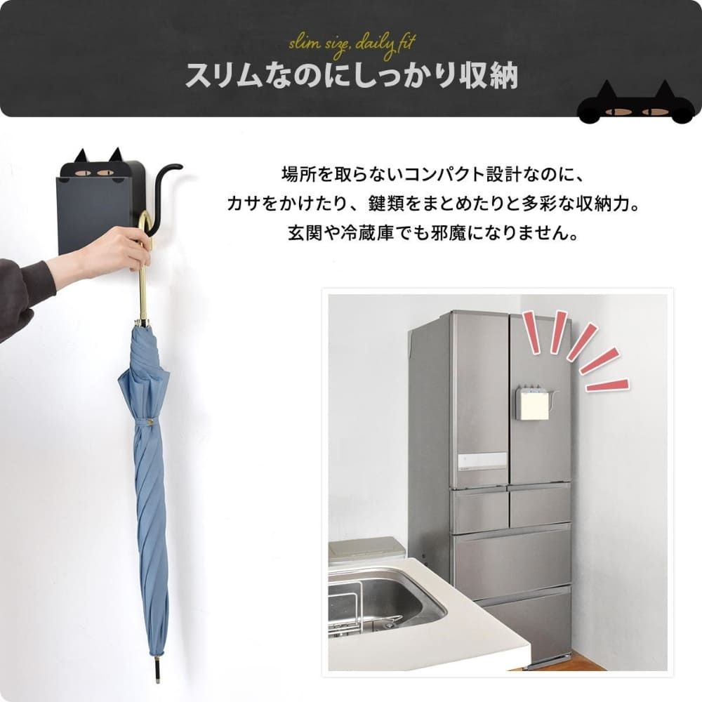 鍵の迷子にさようなら。しっぽフック付きの可愛い猫型キーボックスで、毎日の玄関収納をもっと便利に。マグネットでペタッと貼るだけの簡単設置。スリムなのに鍵やスマートキーをしっかり収納でき、傘やエコバッグも掛けられます。見た目はキュート、中身は頼れるスチール製。玄関やキッチンのスチール面を、おしゃれで機能的なインテリア空間に変える収納アイテムです。