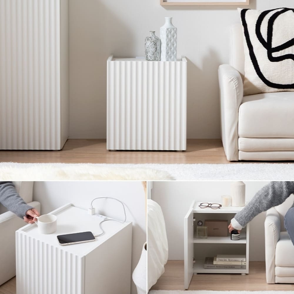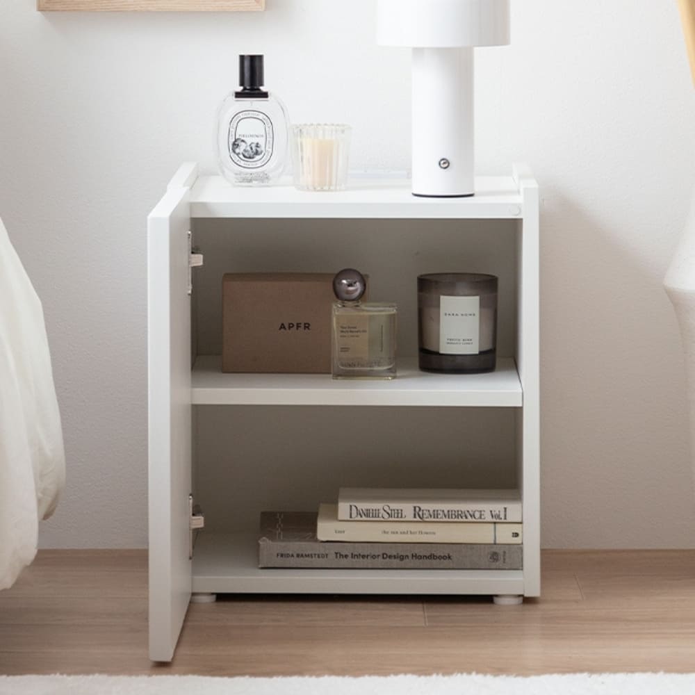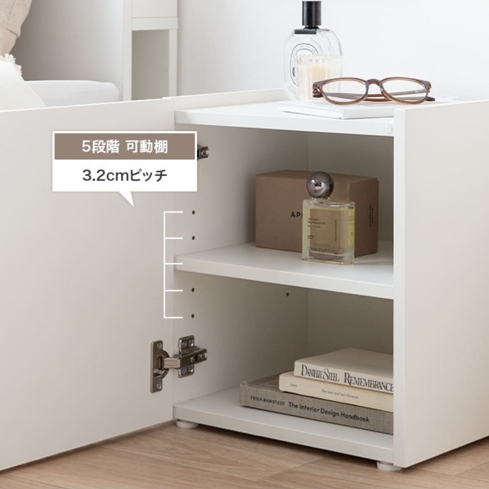 扉の中は小物をすっきり隠せる収納スペースになっており、リビングではリモコンや雑貨、ベッドサイドでは本や充電器、スキンケア用品の整理にも便利。