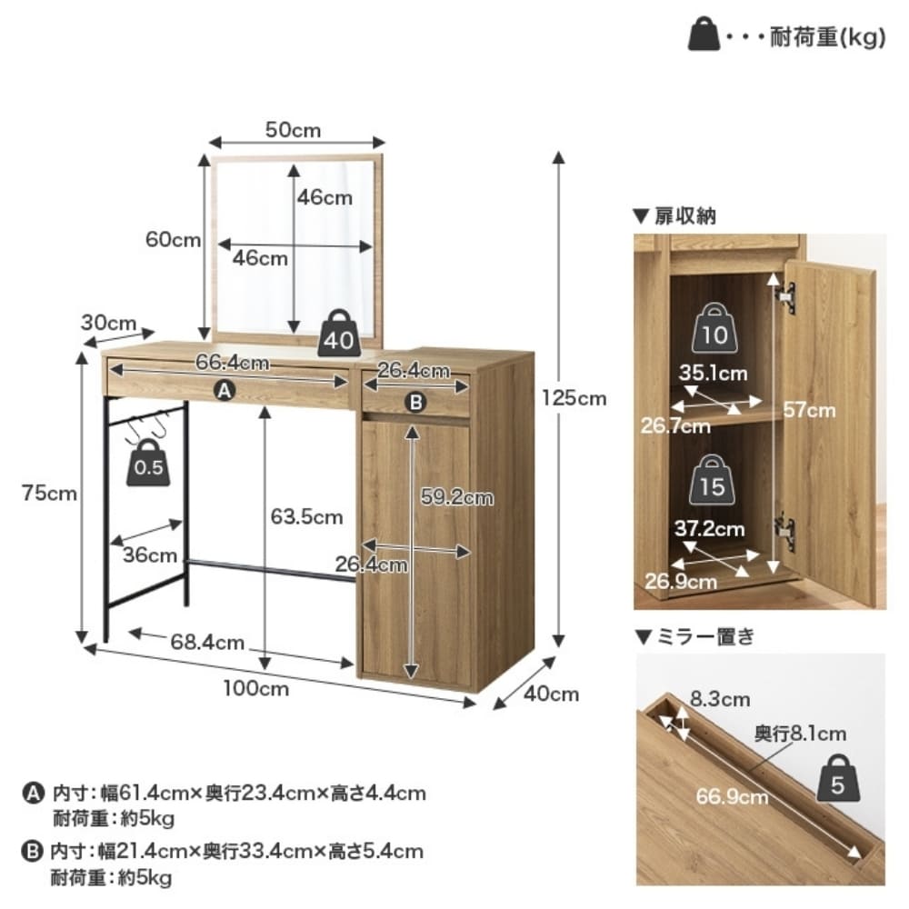 | サイズ(約) | ■本体サイズ 幅100cm×奥行40cm×高さ125cm ■本体重量 約27.8kg ■耐荷重 天板:約40kg、引き出し:(各)約5kg、可動棚:約10kg、扉収納底板:約15kg、サイドバー:約0.5kg、ミラー置き場:約5kg |