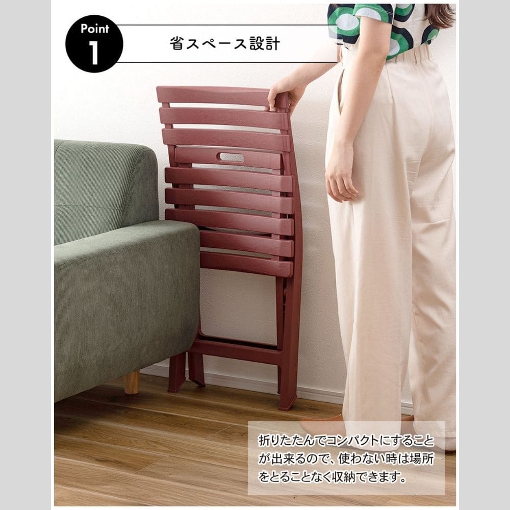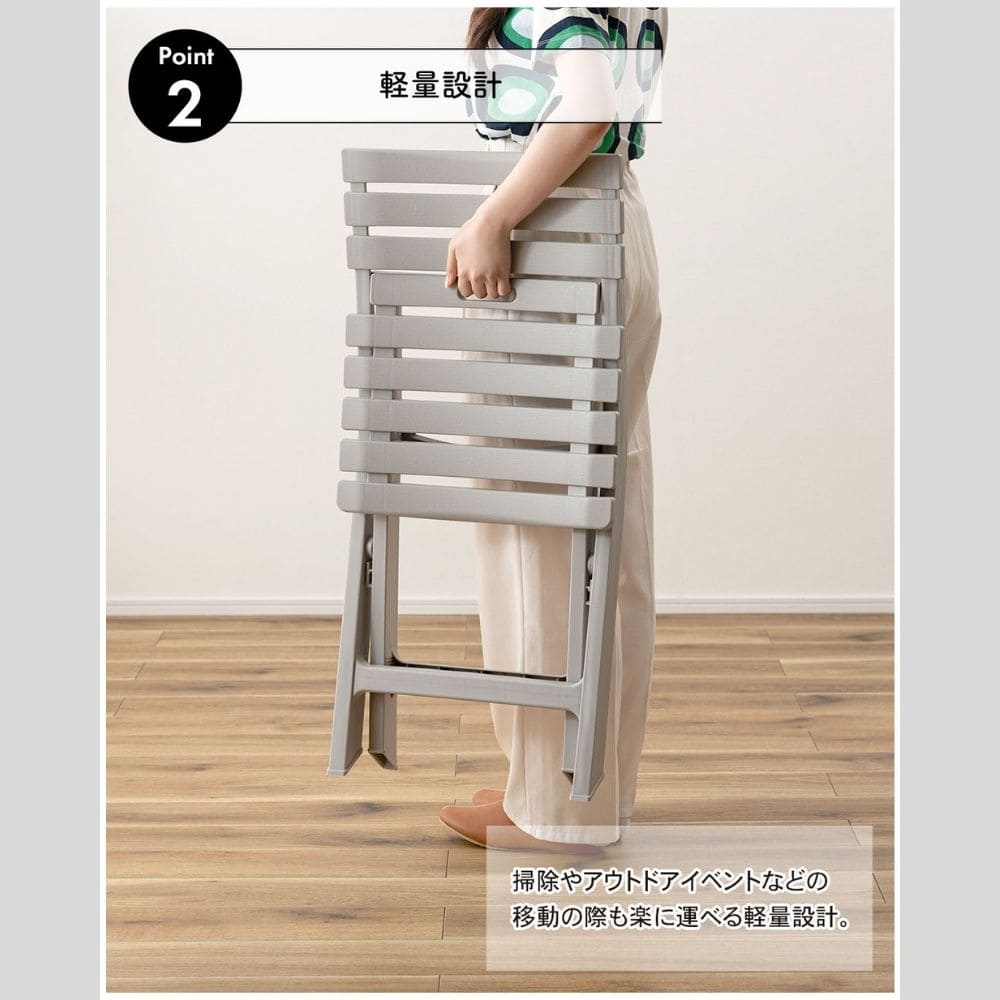 落ち着いたカラーとすっきりした形で、インテリアになじみやすいのも魅力。使わない時はコンパクトに収納できる便利なチェアです。