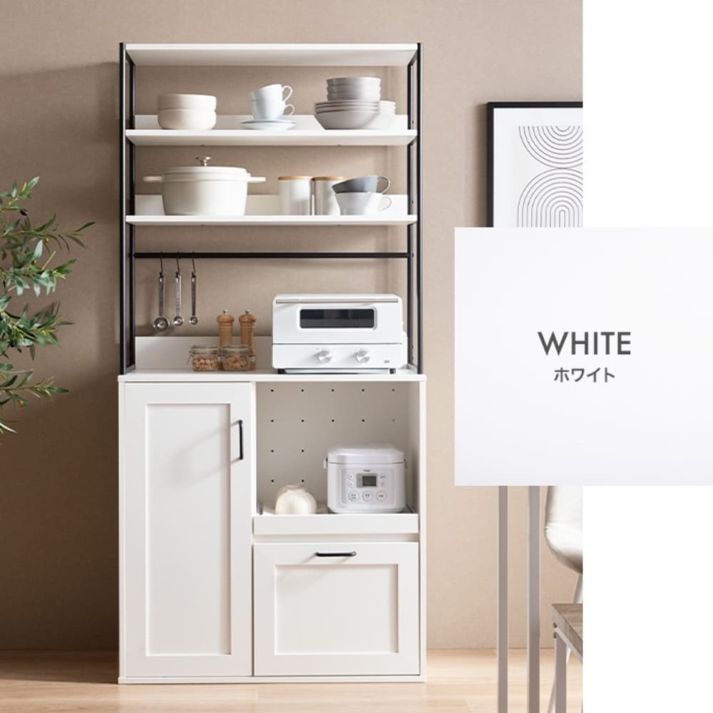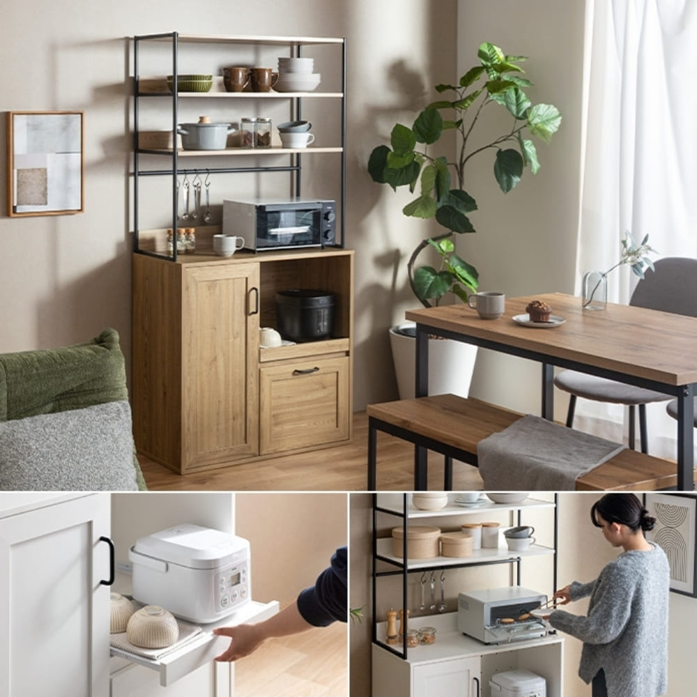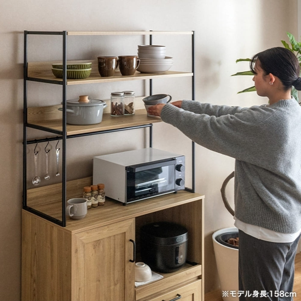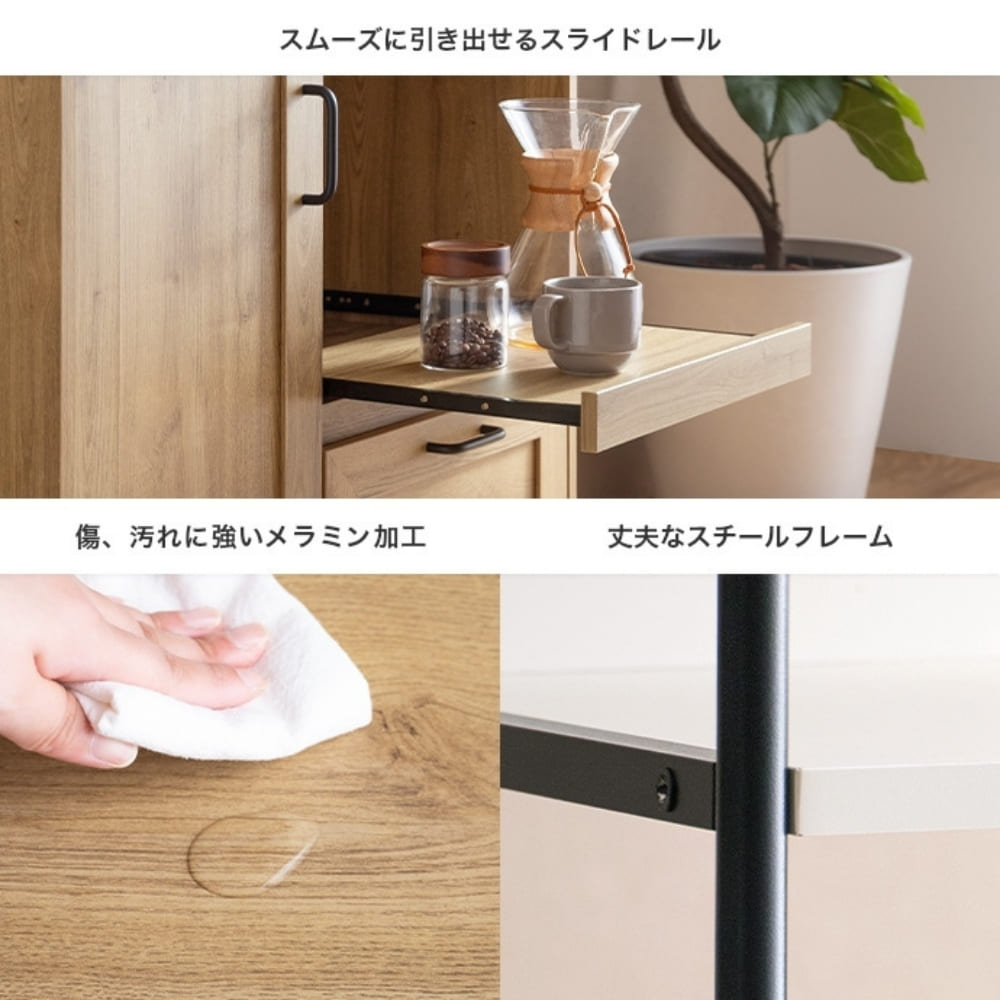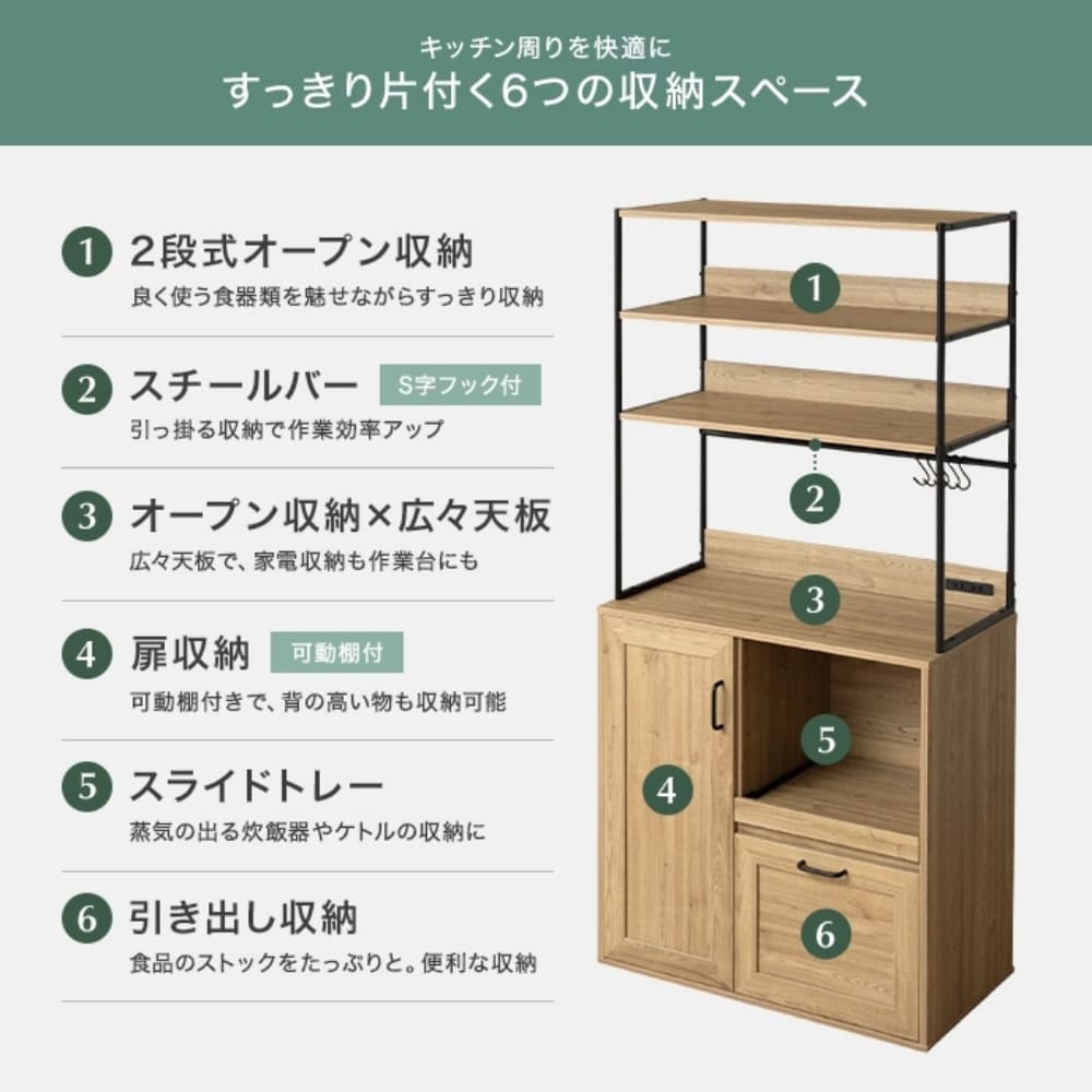 2段のオープン棚、S字フック付きスチールバー、広々使える天板、可動棚付き扉収納、上下どちらにも設置できる伸縮スライド台、深型引き出しの6つの収納スペースを備え、散らかりやすいキッチン小物もすっきり整頓。