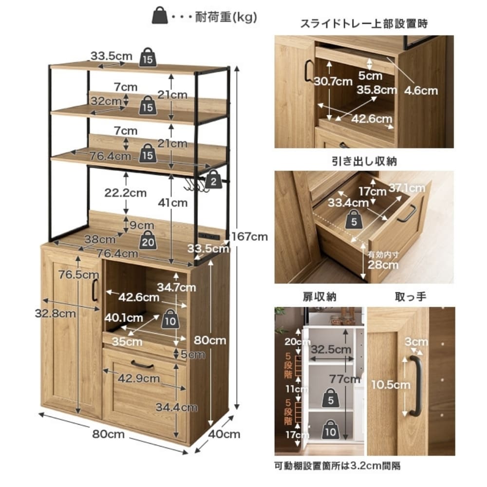| サイズ(約) | 本体サイズ: 幅 80cm × 奥行 40cm × 高さ 167cm 商品重量: 約 41.9kg 耐荷重: オープン収納棚 (各)約15kg、スチールバー 約2kg、中央天板 約20kg、扉収納可動棚 (各)約5kg、扉収納底板 約10kg、スライドトレー 約10kg、引き出し底板 約5kg |