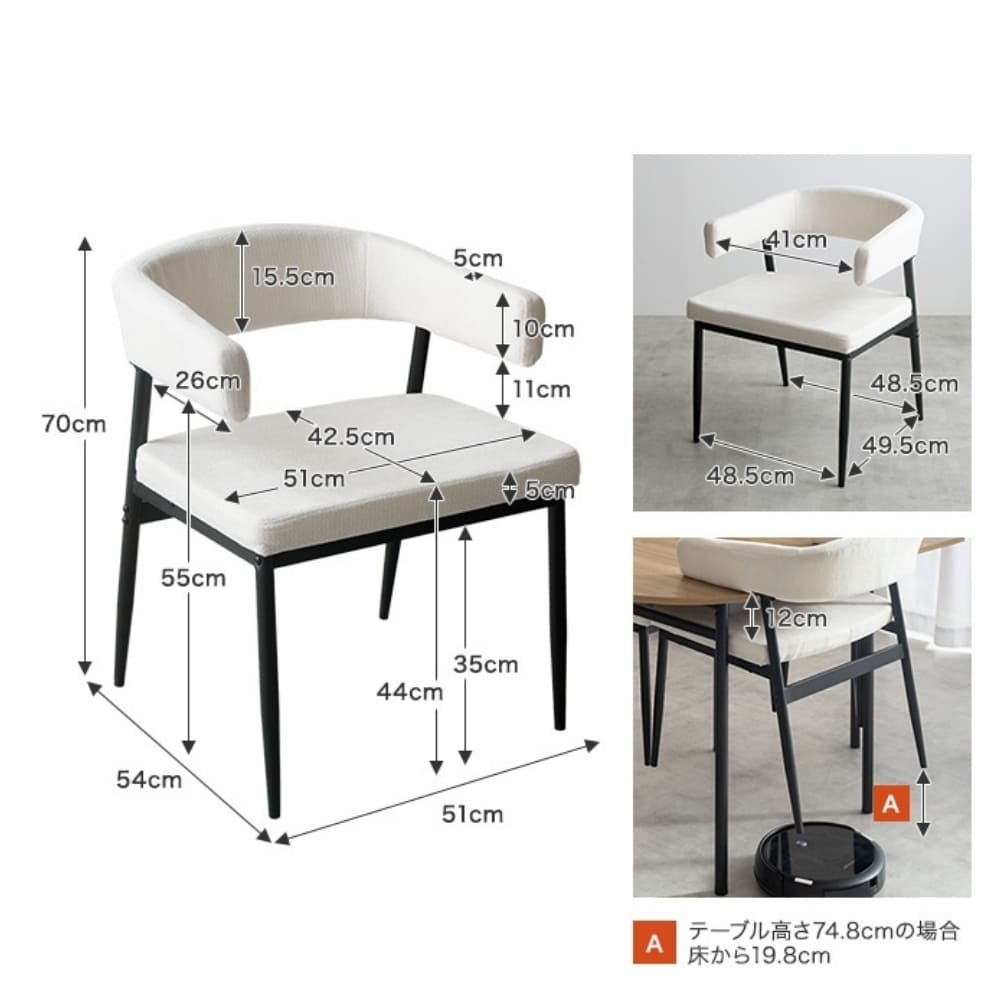 | サイズ(約) | 本体サイズ: 幅 51cm × 奥行 54cm × 高さ 70cm (座面高 44cm) 商品重量: 約 5.7kg 耐荷重: 約100kg |