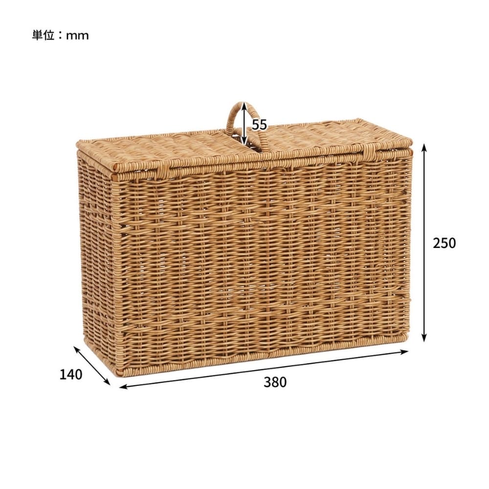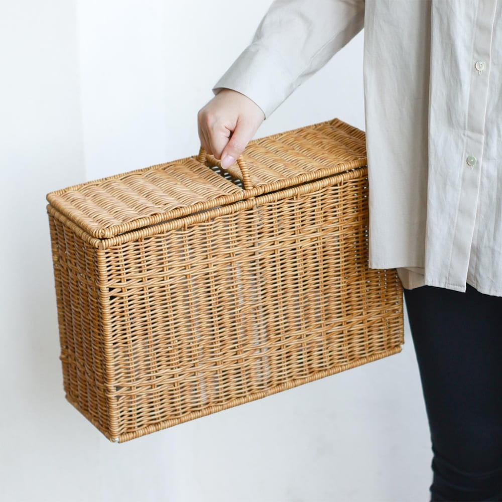 蓋付きで中身を隠してほこりを防ぎ、持ち運びしやすいハンドル付き。