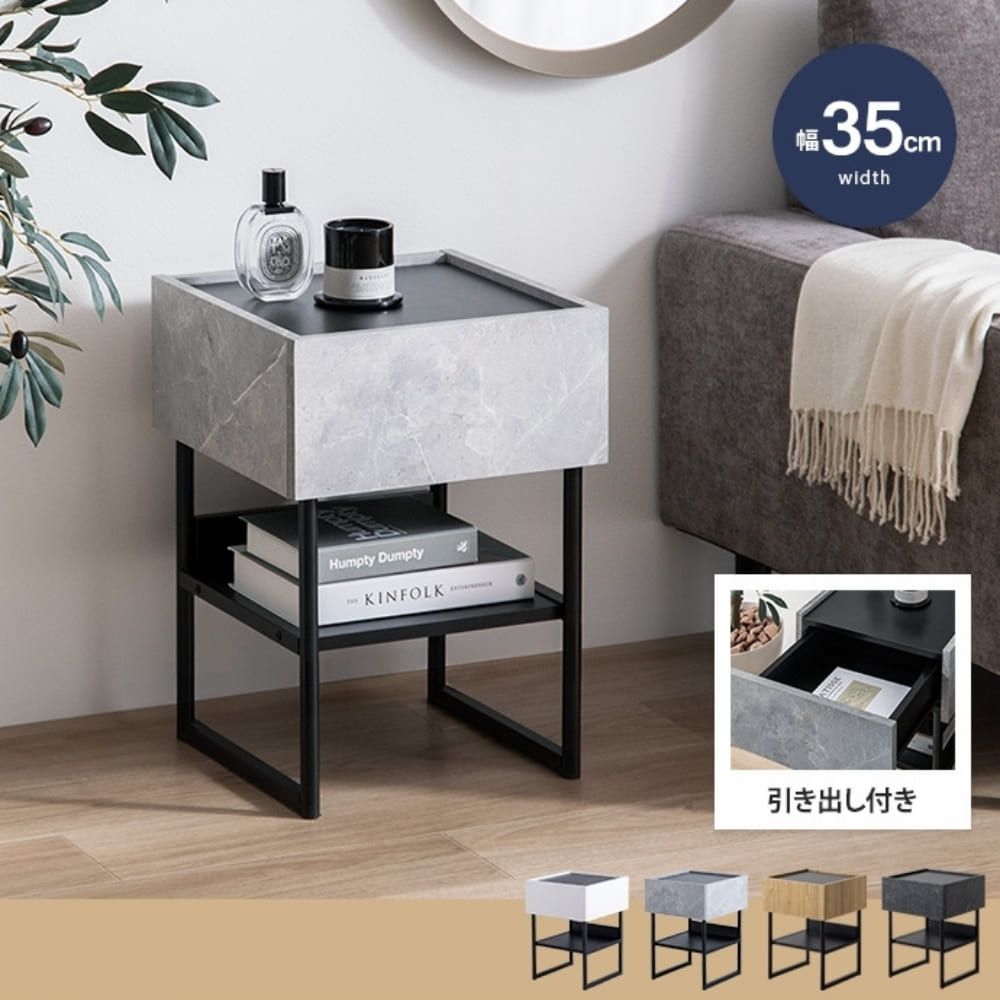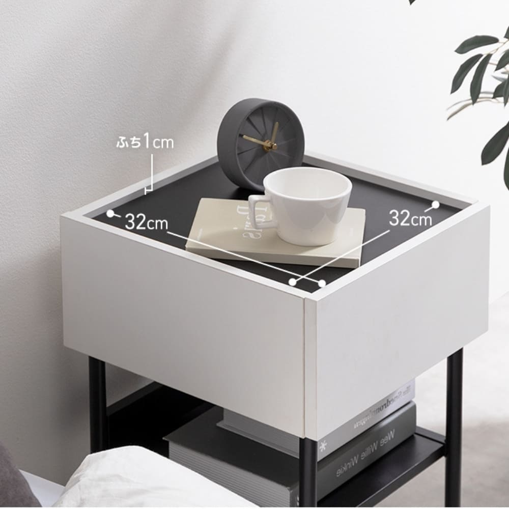 幅35cm×奥行35cmのコンパクトサイズながら、天板はふち付きのトレイ型だから、飲み物やスマホ、時計などのちょい置きにも便利です。