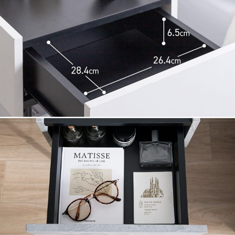さらに収納力のある引き出しとオープン棚を備えながらもコンパクトな設計で、リビングや寝室など場所を選ばずお使いいただけます。