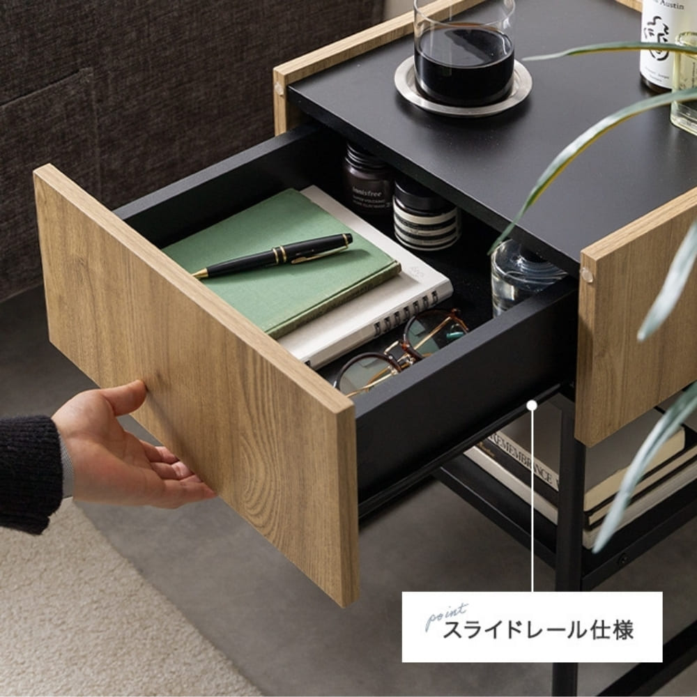 引き出しは細かな小物をすっきり隠して収納でき、オープン棚には本やリモコンをさっと手に取りやすく整理可能。