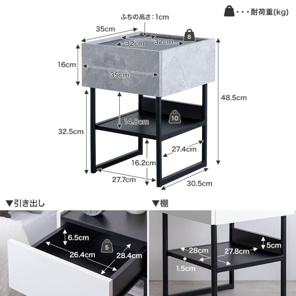 | サイズ(約) | 本体サイズ: 幅 35cm × 奥行 35cm × 高さ 48.5cm 商品重量: 8.8kg 耐荷重: 天板 約 8kg 、引き出し 約 5kg、棚 約 10kg |