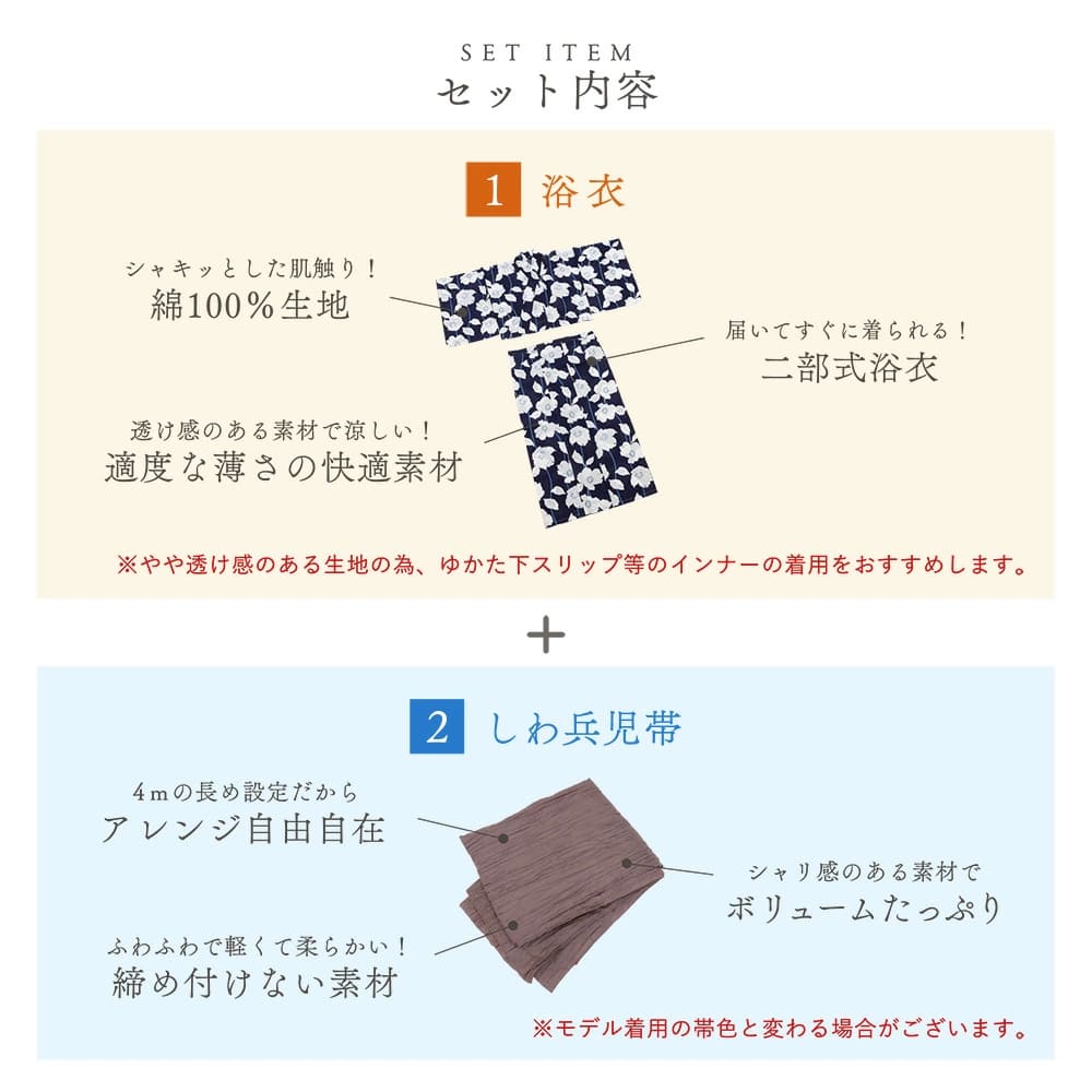 二部式浴衣としわ兵児帯 2点セットの商品です。その他の小物は付属しません。