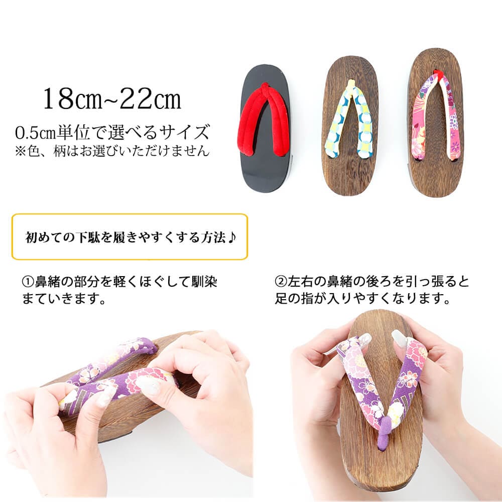 初めて下駄を履くお子さまでも安心♪ 鼻緒の調整方法もご紹介しており、履き心地を自分で調整できます。