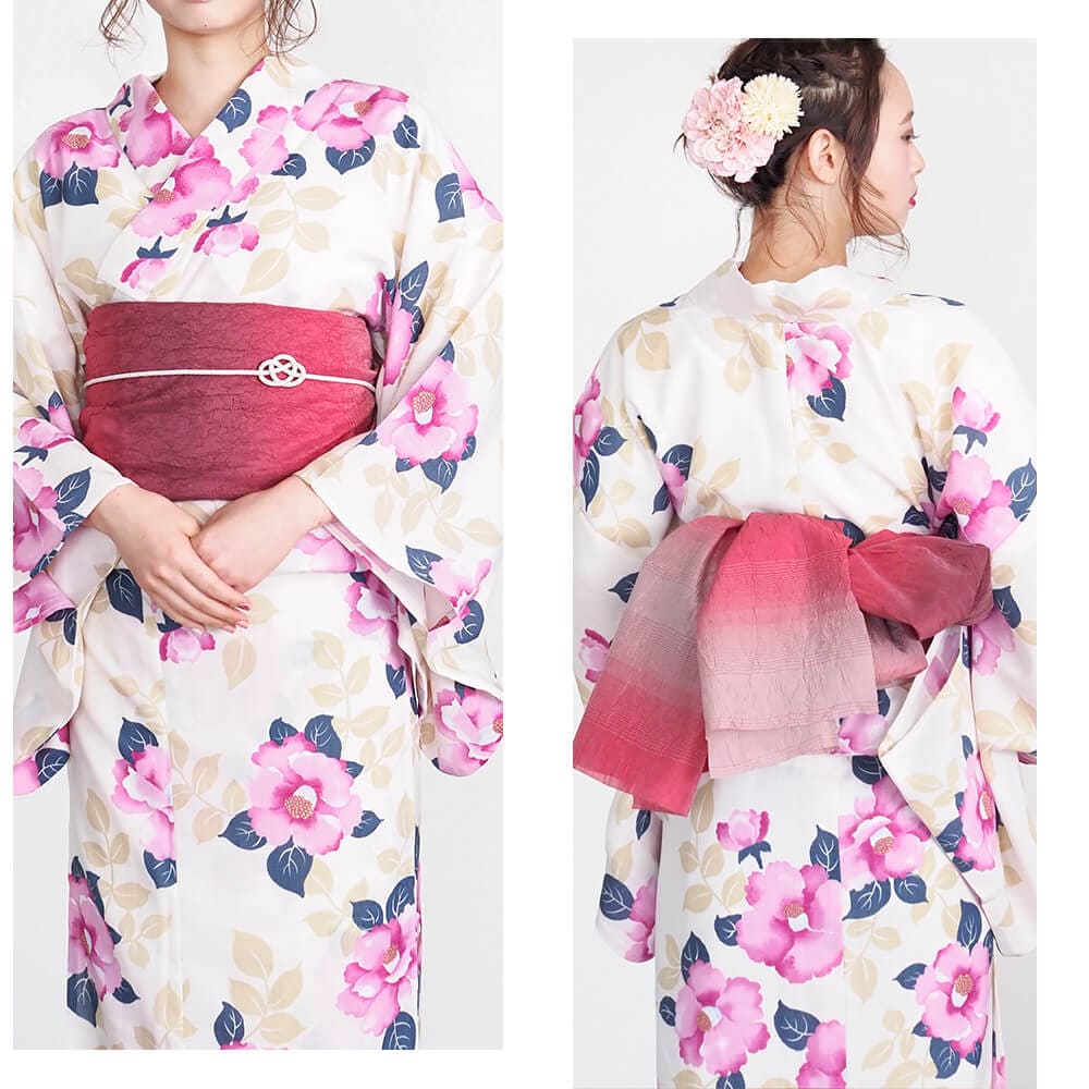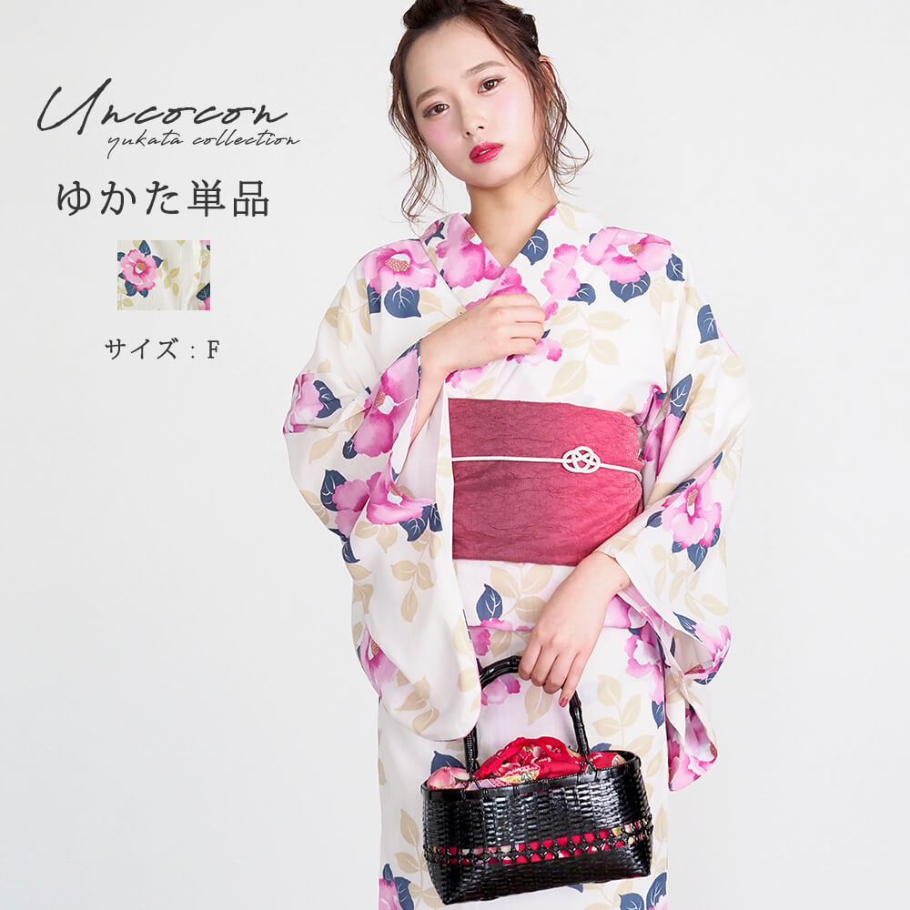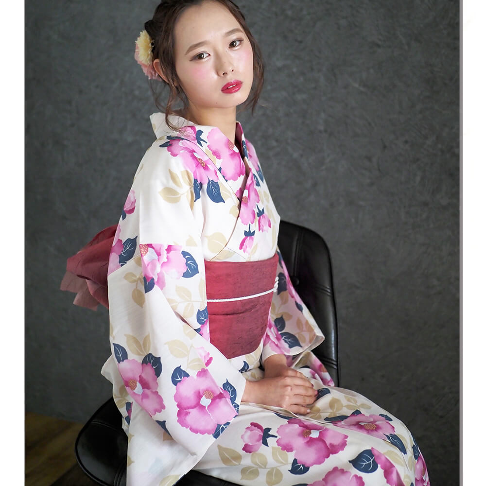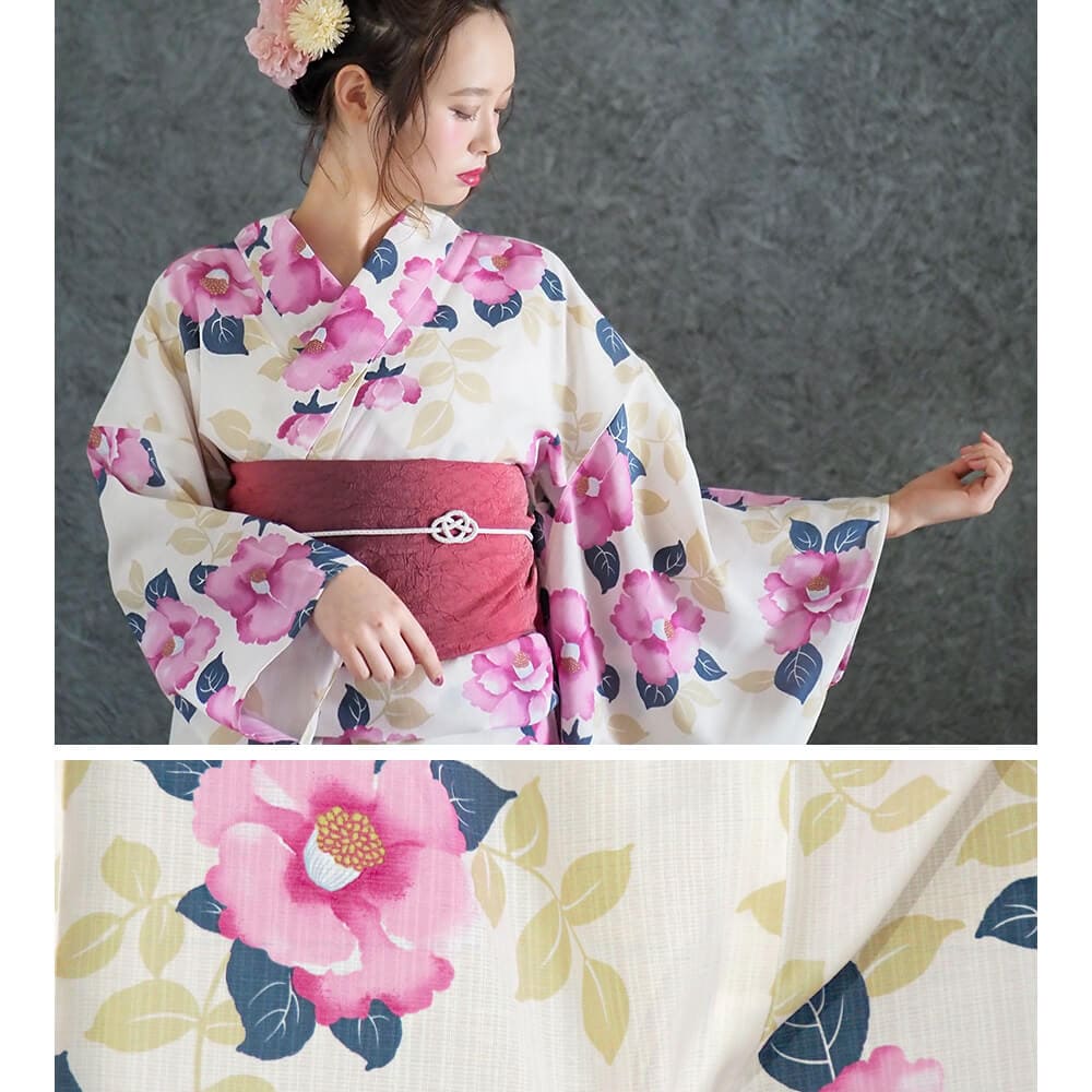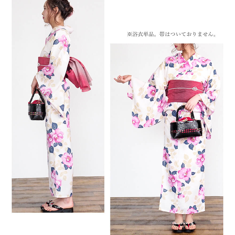 夏を楽しむ和装スタイルにぴったりな、ピンク椿柄のレディース浴衣です。