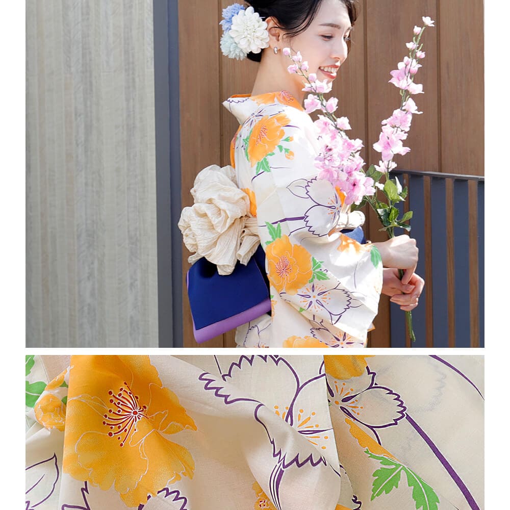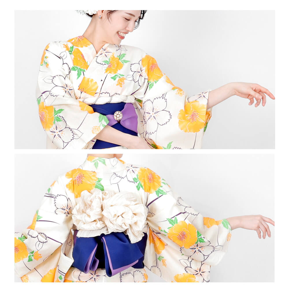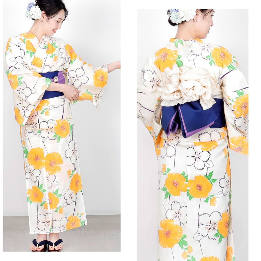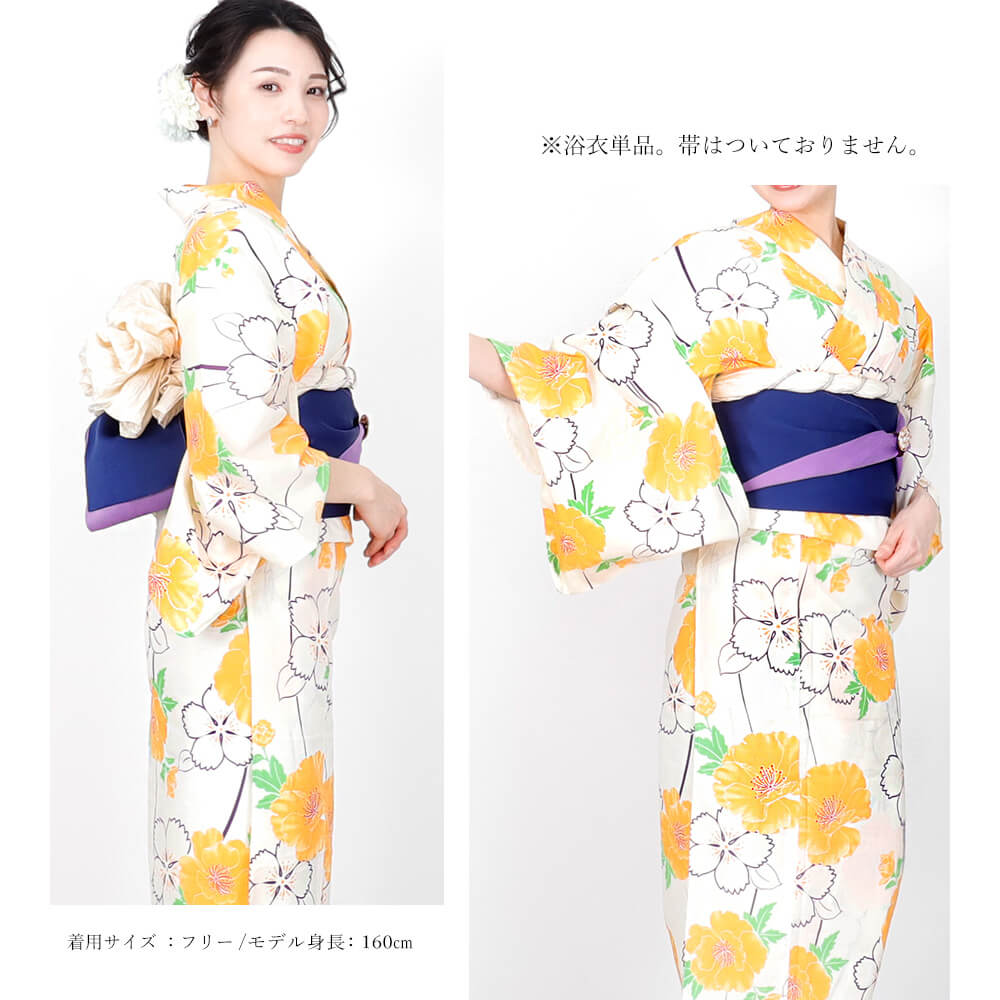 鮮やかなイエローの花柄が華やかに映える、綿100%の夏らしい浴衣。