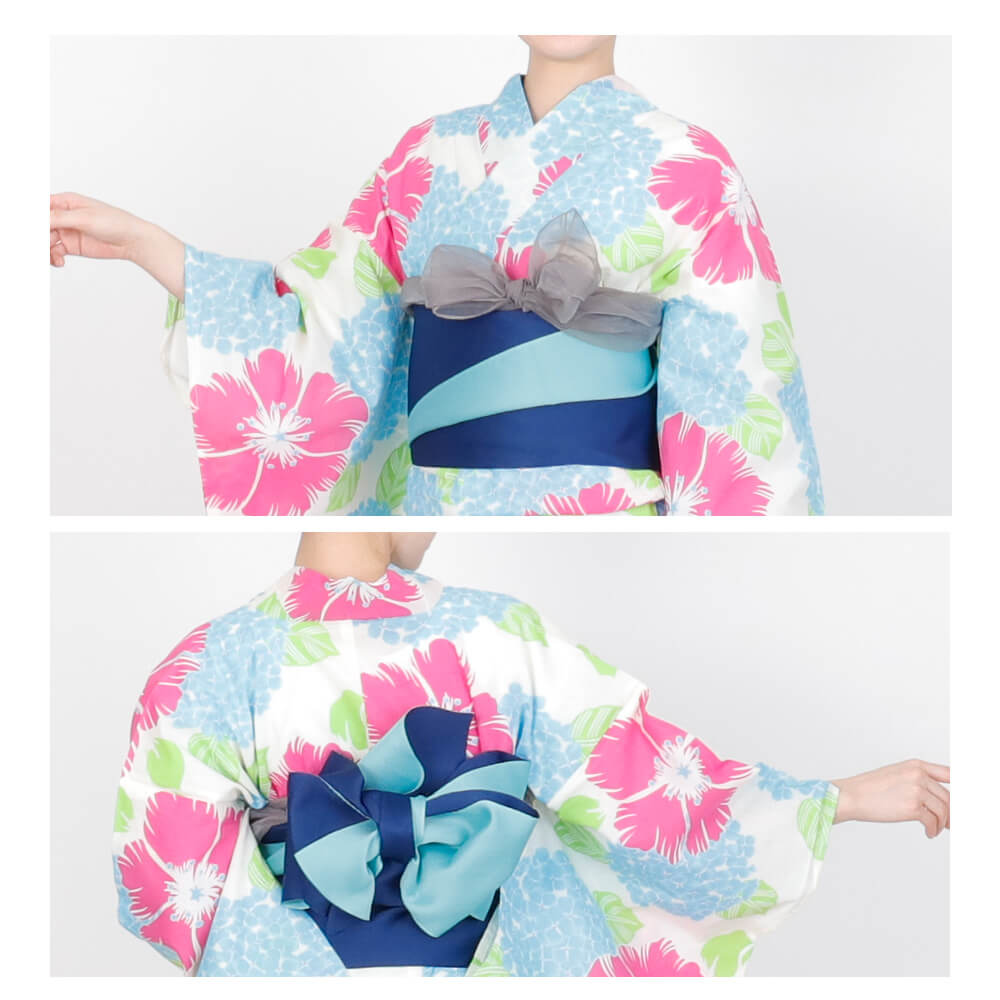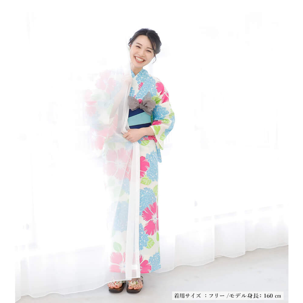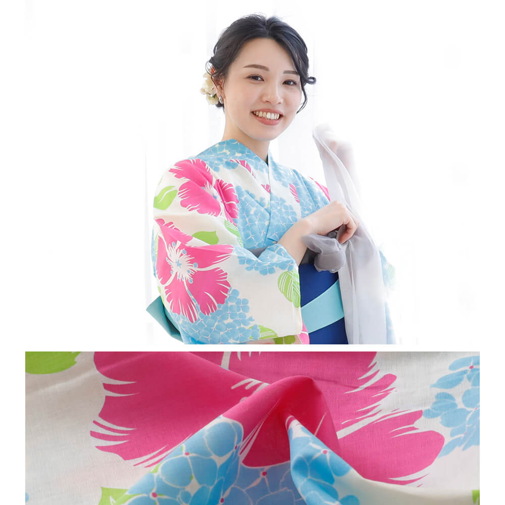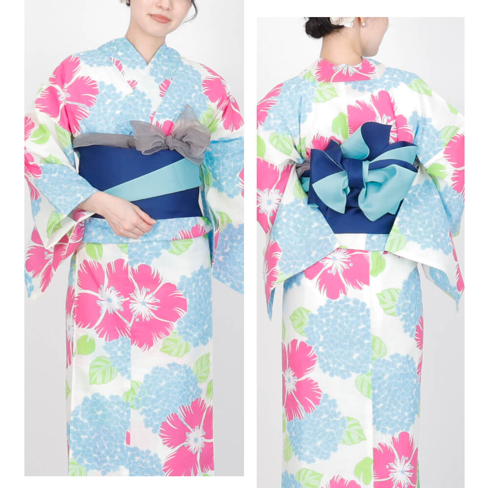 夏のお出かけにぴったり!鮮やかなピンクの花とブルーのあじさい柄が目を引く、爽やかで華やかなレディース浴衣。