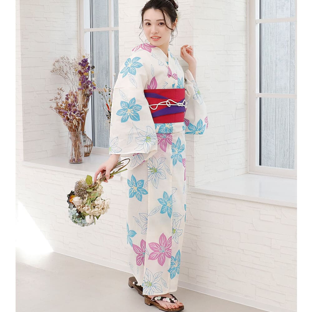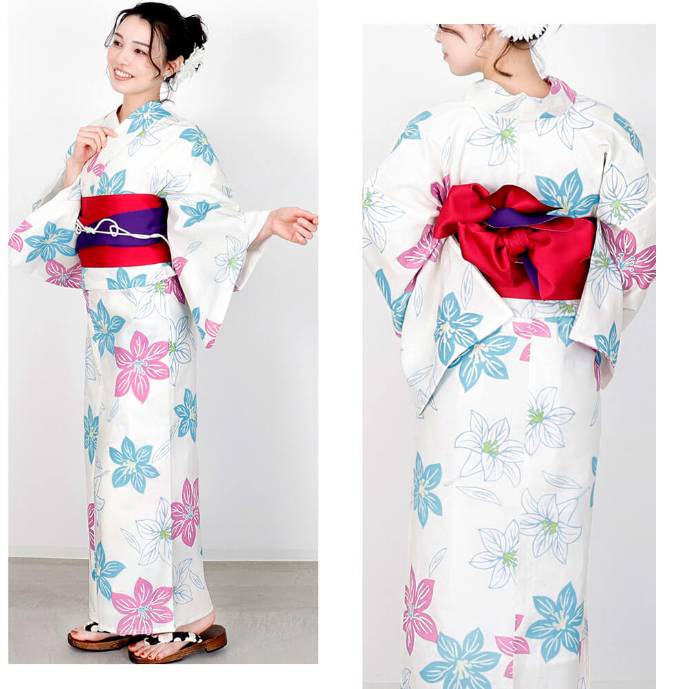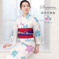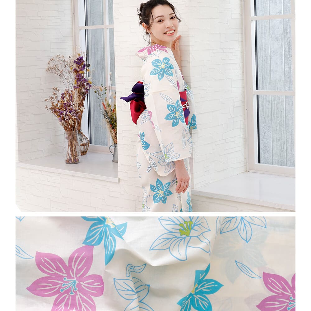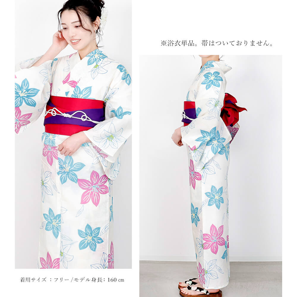 清涼感あふれる白地に、ブルーとピンクの花柄が爽やかに映えるレディース浴衣。
