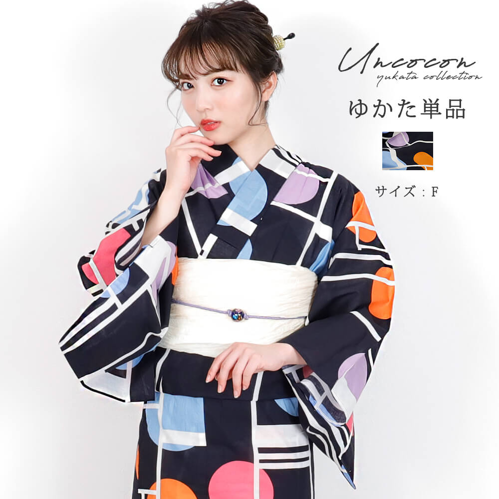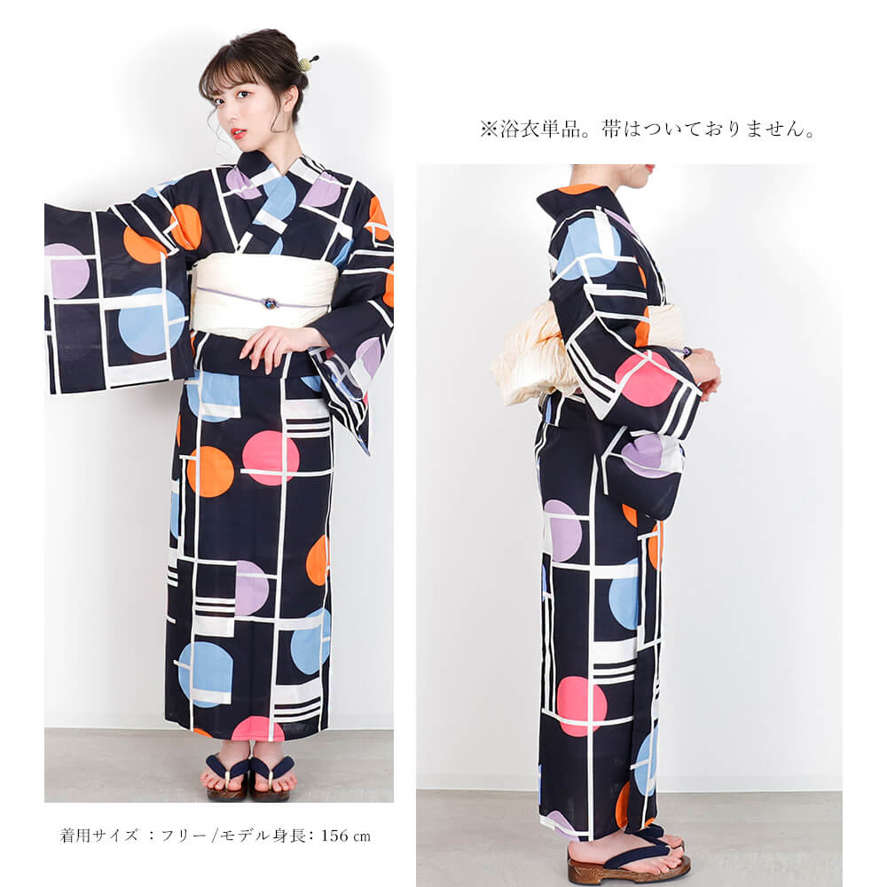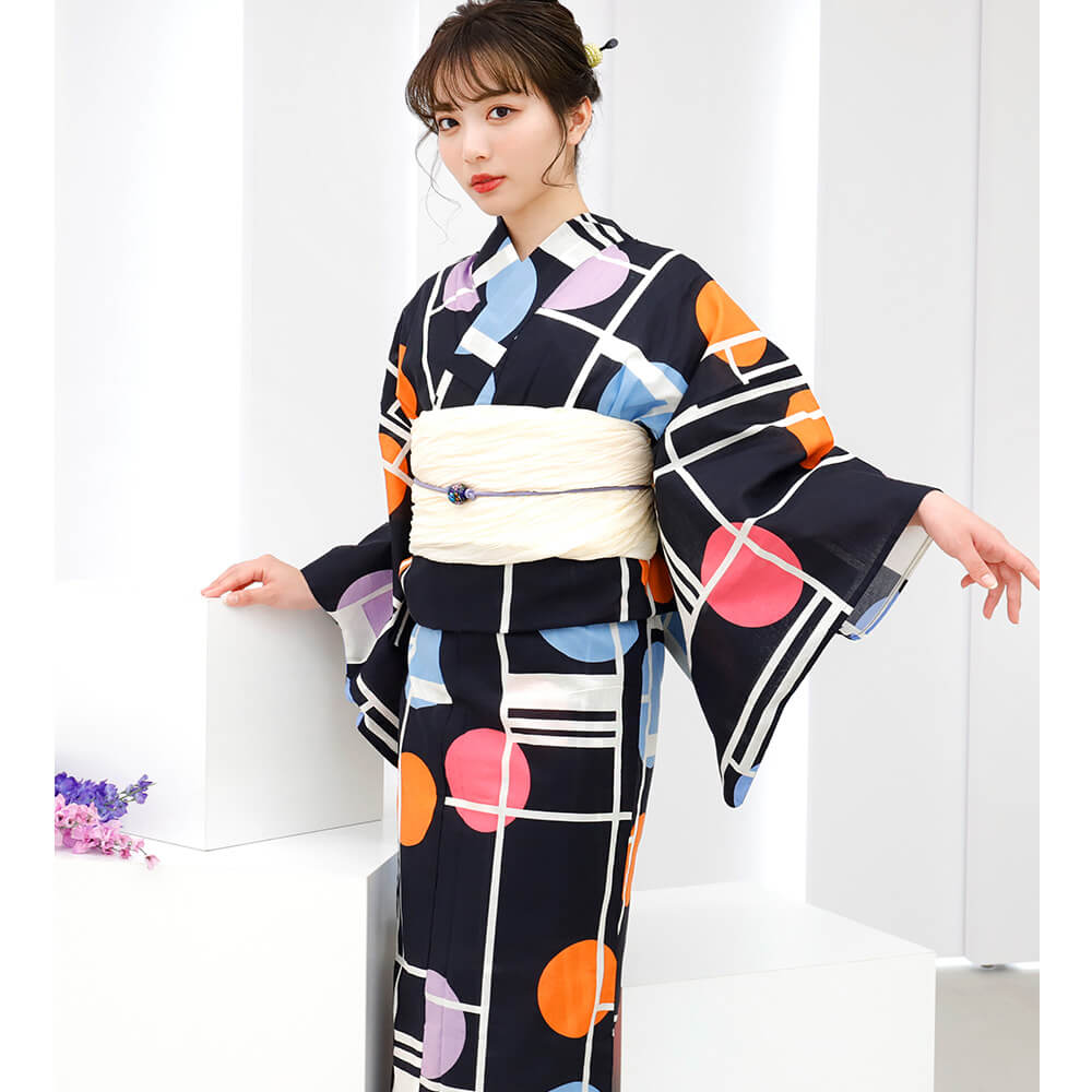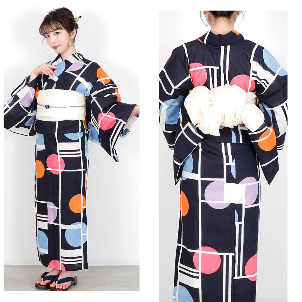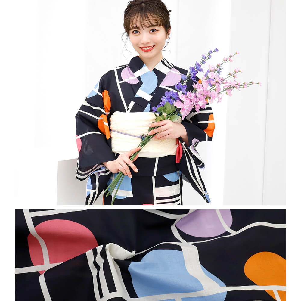 シンプルなのに目を引く、モダンアート風の幾何学模様が魅力のレディース浴衣です。