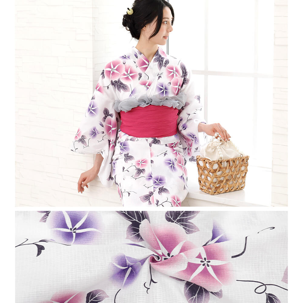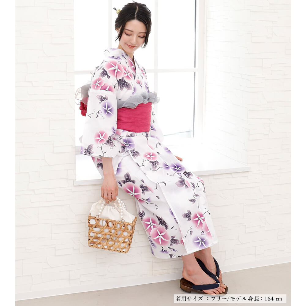 爽やかな白地に、ピンクとパープルの朝顔がふんわり咲き、夏のイベントにぴったりの華やかさ。