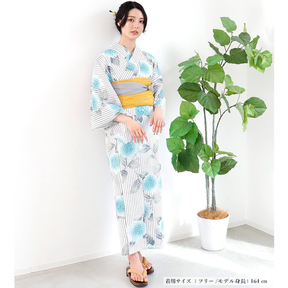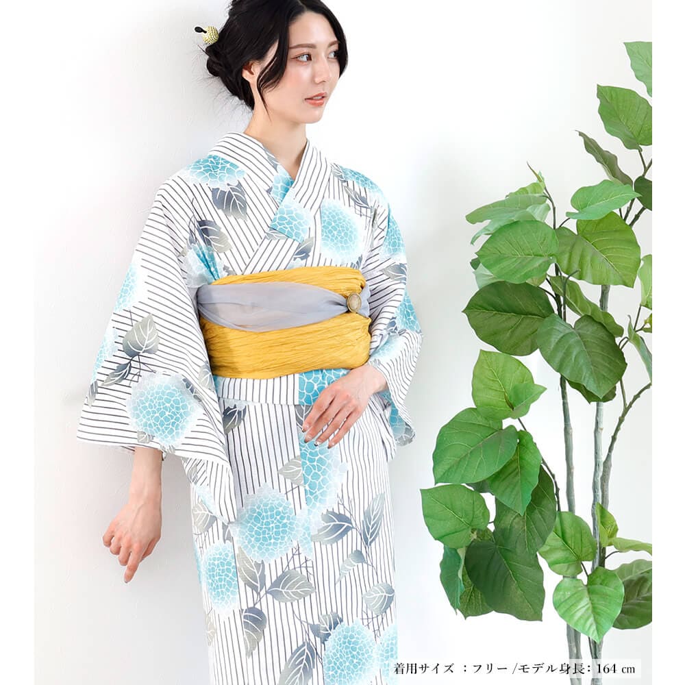 『柳あじさいの咲く夏』は、爽やかな水色のあじさいとやさしいグレーの柳葉が涼しげな印象を与える二部式浴衣です。