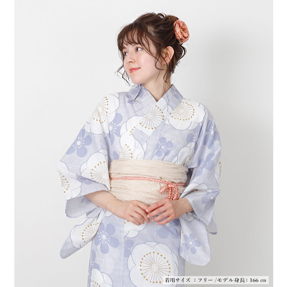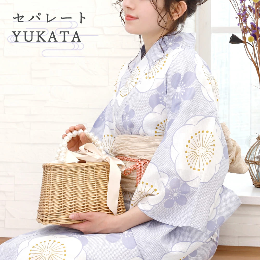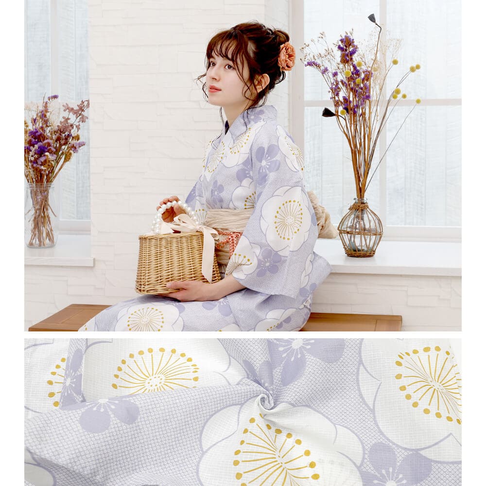 上品な藤紫に白い梅がふんわり咲く、夏の空気にぴったりのセパレート浴衣「紫の空に咲く梅」。
