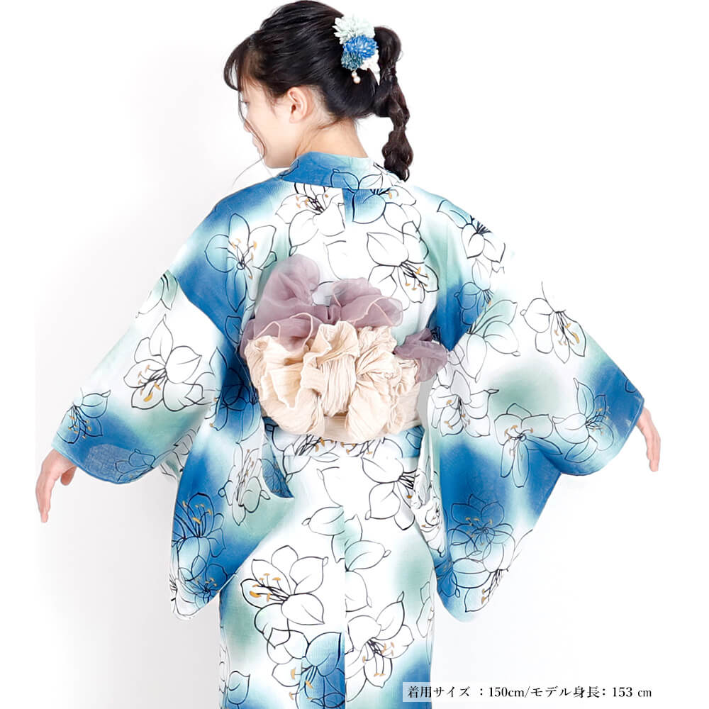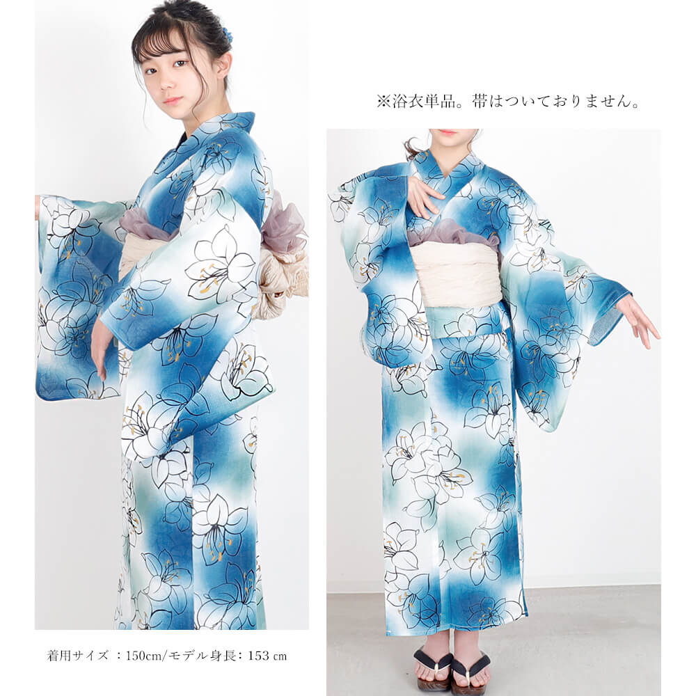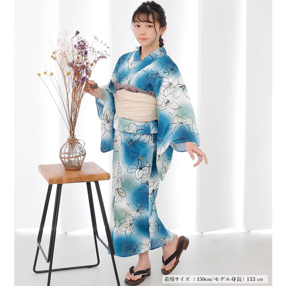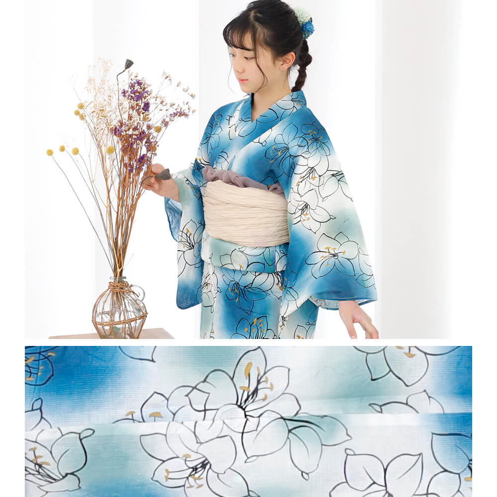 落ち着いたブルーに可憐な白花が映える、ジュニア向け浴衣「リリグラブルー」は、小柄な方にもおすすめの140cm・150cmの2サイズ展開。