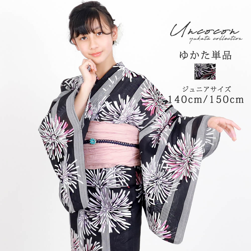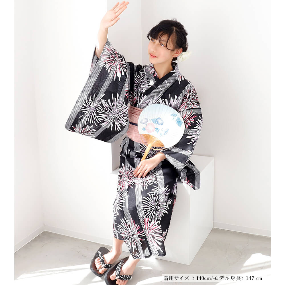 シックで華やかな花火柄が目を引く《宵闇花火ブラック》の浴衣は、ジュニアから小柄な大人の方まで幅広く楽しめるストロベリーサイズ対応。