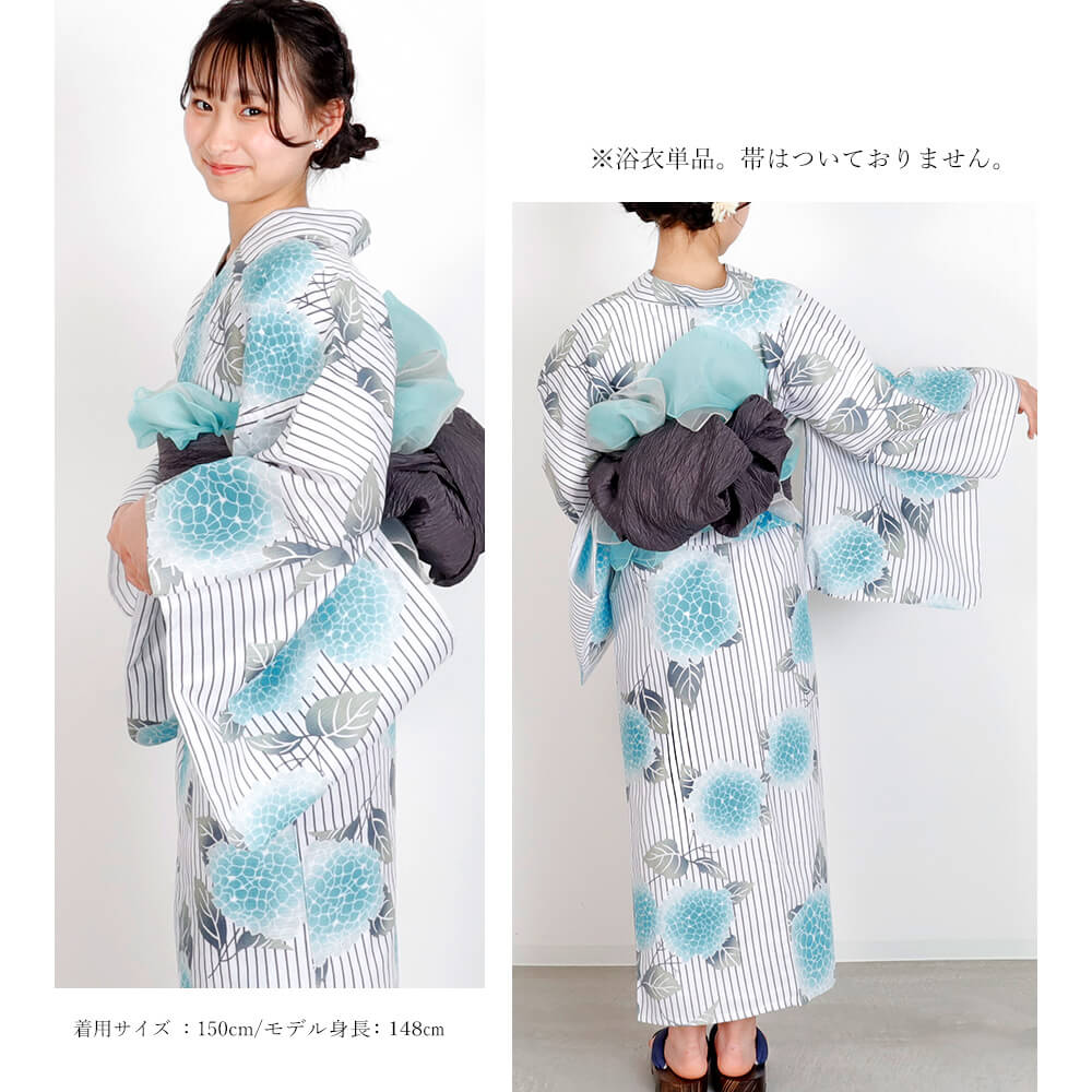 透明感のある水色のあじさい柄が目を引く《柳あじさいの咲く夏》は、ジュニアから小柄な女性まで着られるストロベリーサイズの浴衣です。