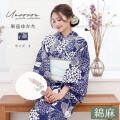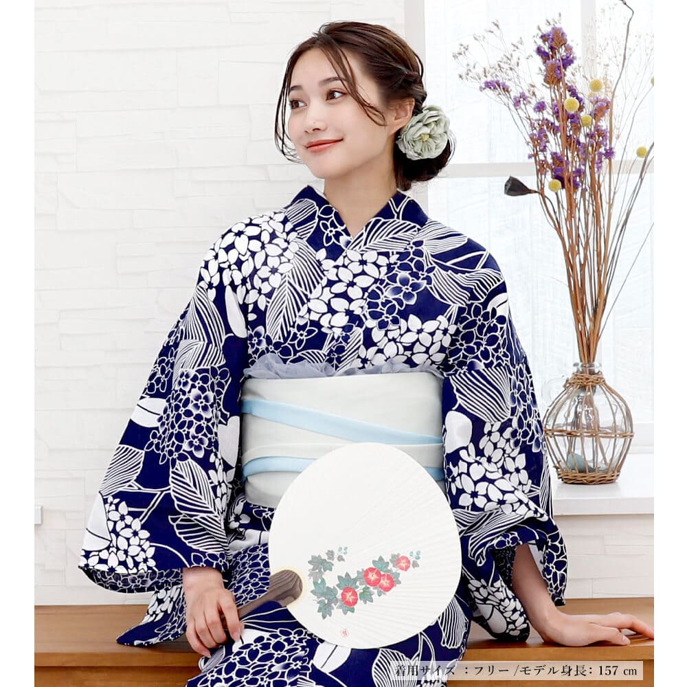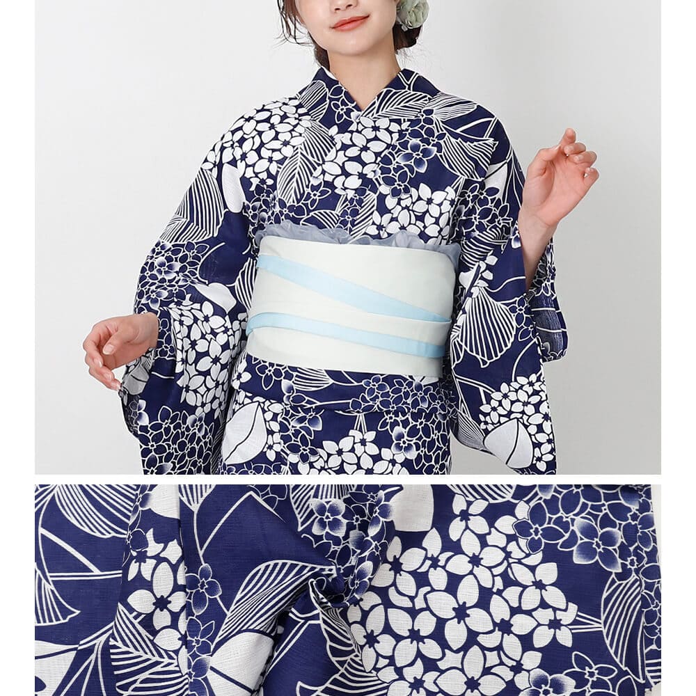 上質な綿麻素材で差がつく、紺藍あじさい柄の仕立て上がり浴衣。