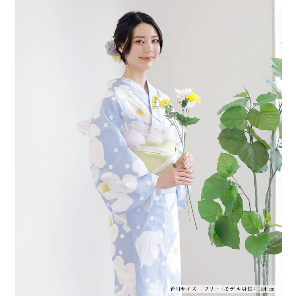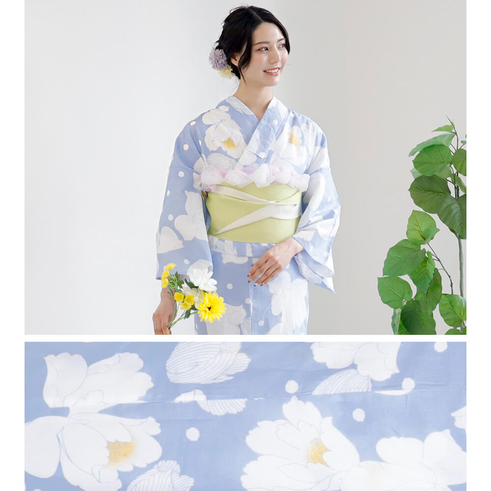清涼感あふれる淡い空色に、ふんわりと咲いた椿が印象的な「カメリアスカイ」は、綿100%の心地よい肌ざわりが特長の浴衣です。