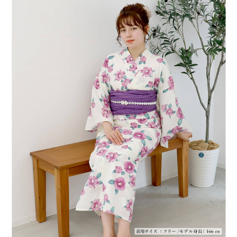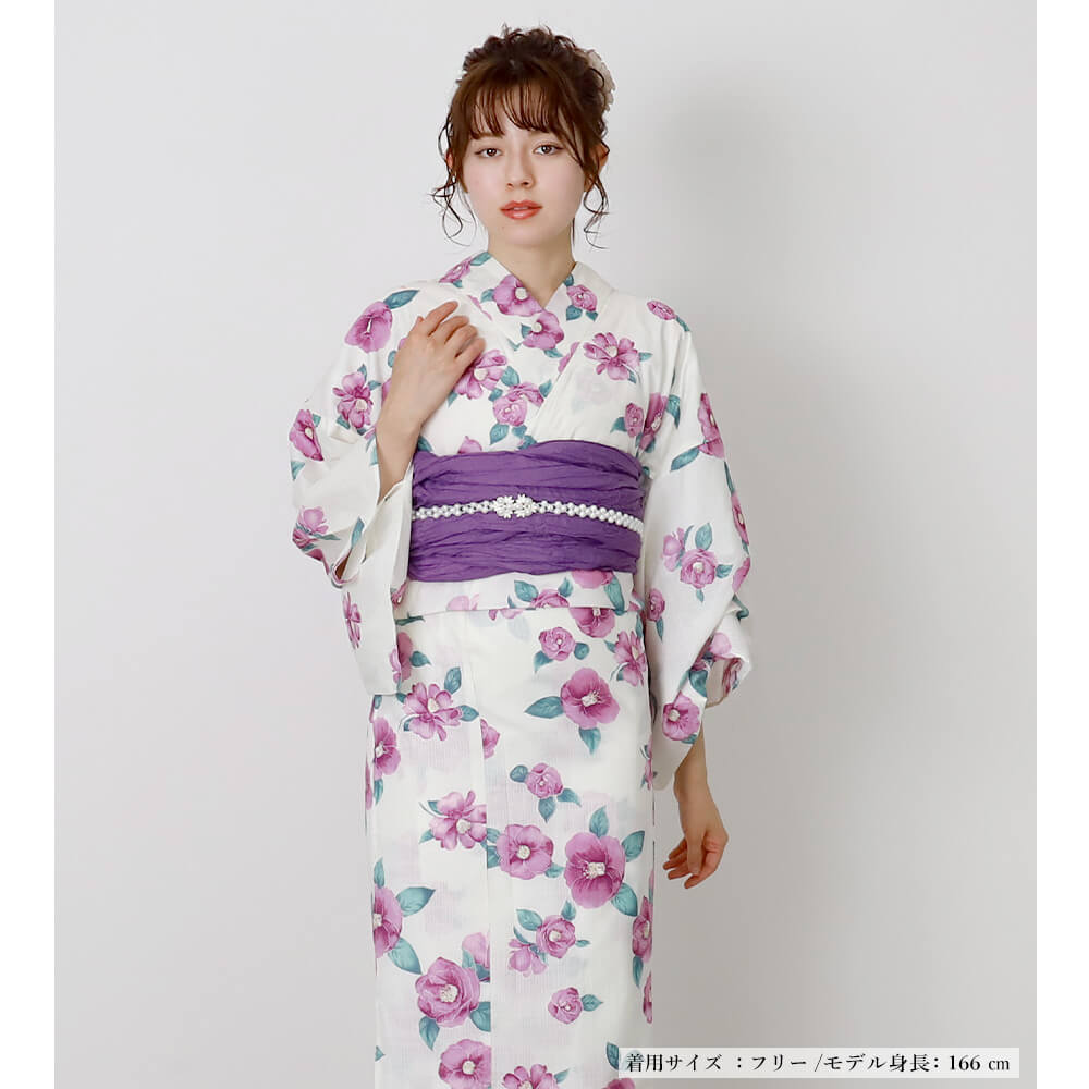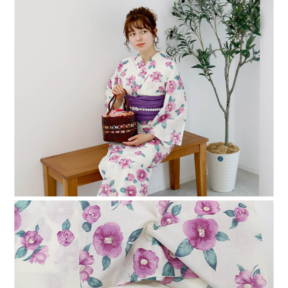 「若紫の椿咲き」は、白地に咲く優しい紫の椿が印象的な上品な浴衣です。