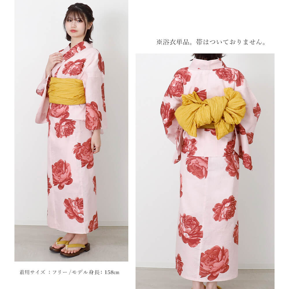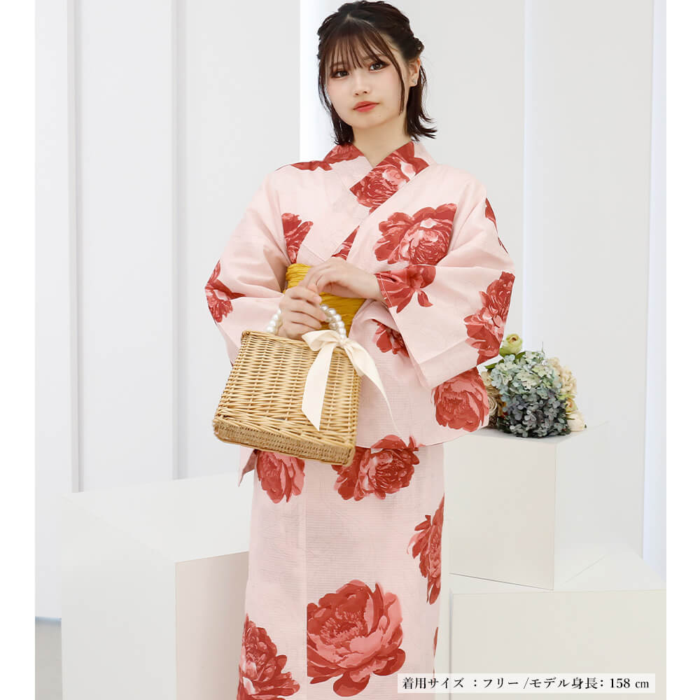 大胆に描かれたピオニー(芍薬)が視線を引きつける、可憐で華やかな二部式浴衣。