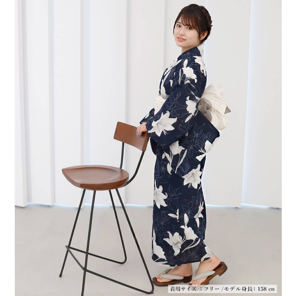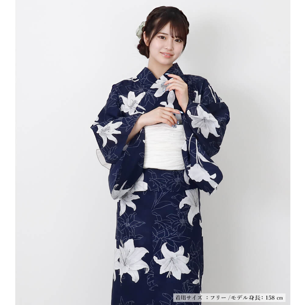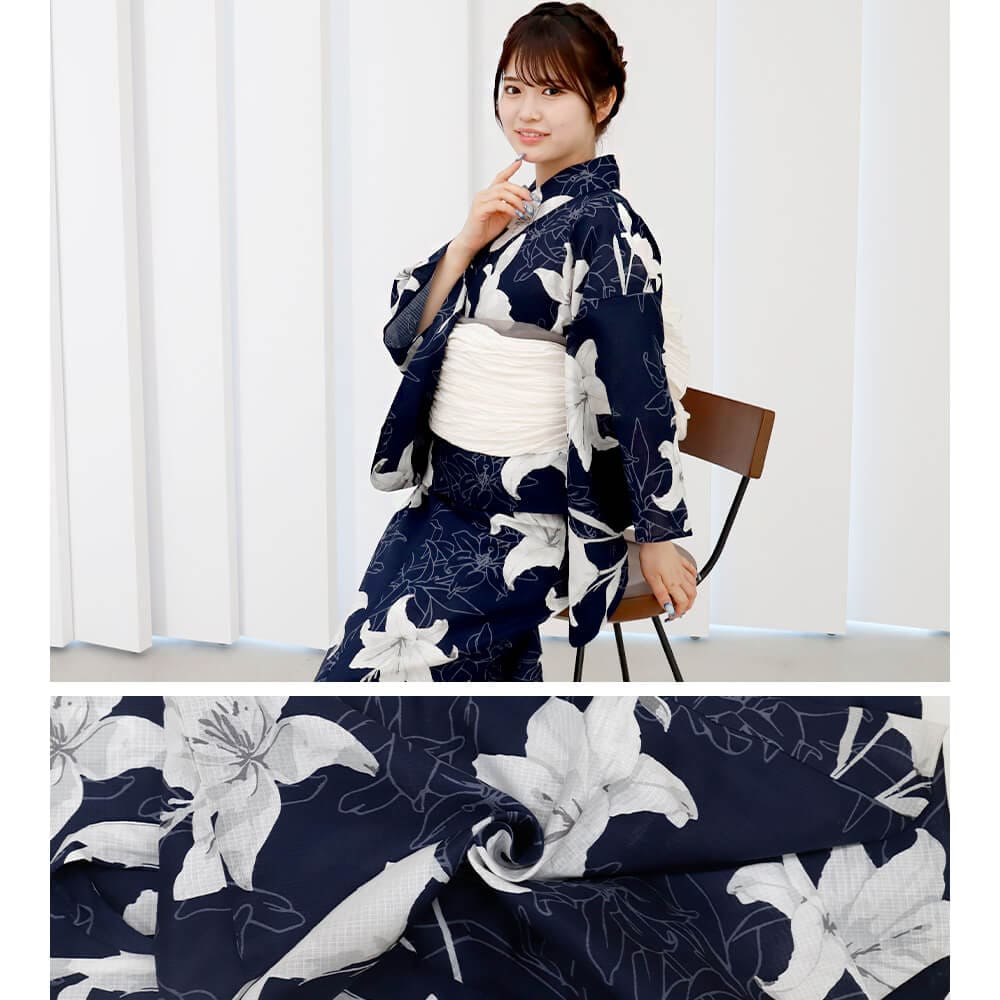 「リリーインディゴスカイ」は、濃紺の生地に咲き誇る白百合が美しい、大人の女性にぴったりな二部式浴衣。