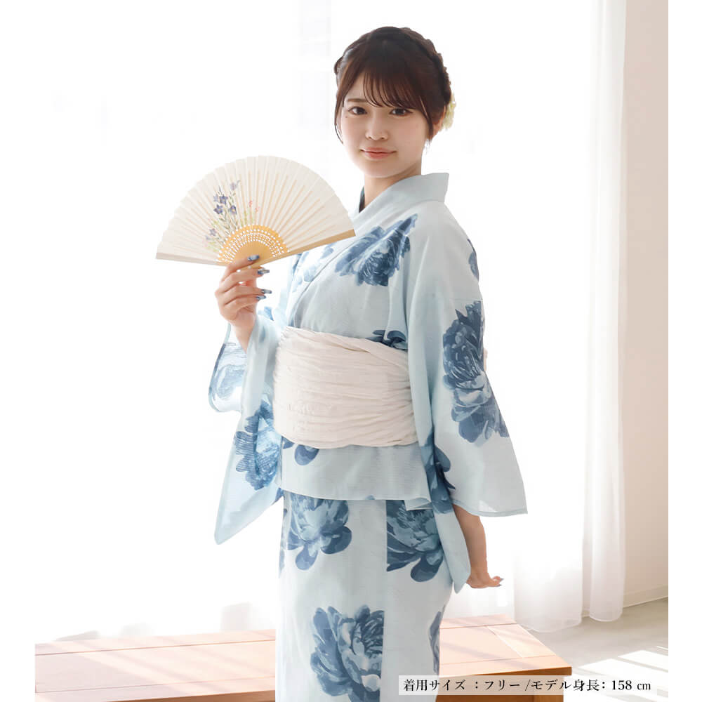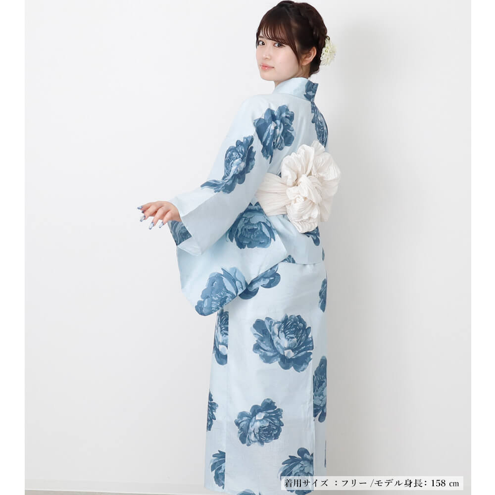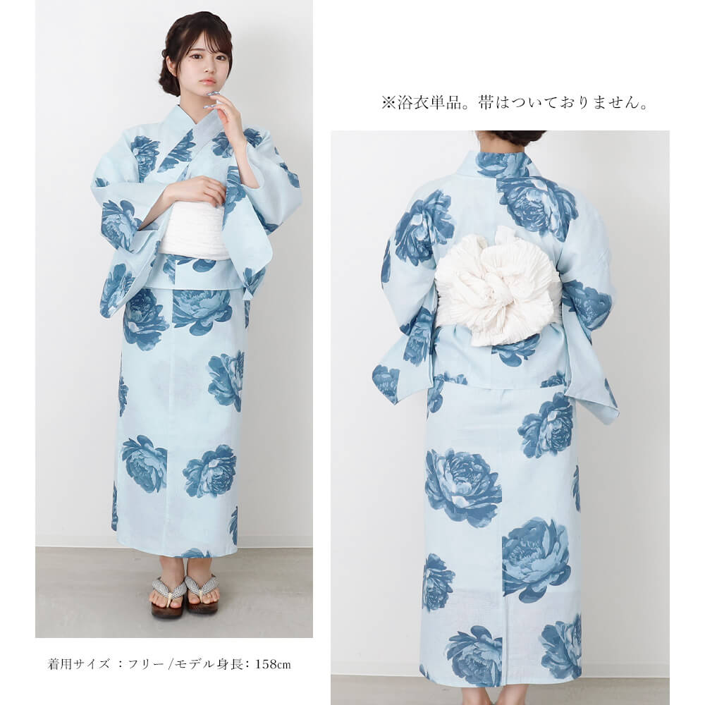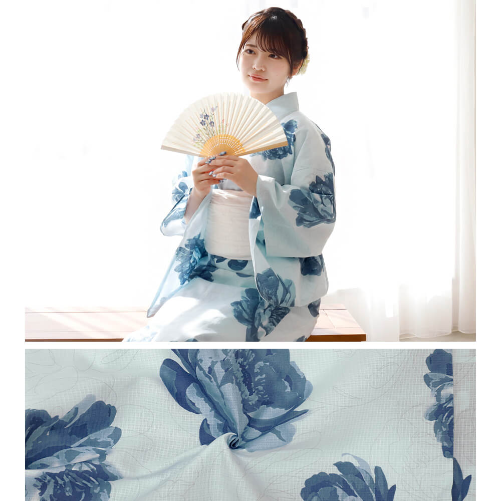 「薄青ピオニーの咲きこぼれ」は、爽やかなライトブルーの地に、大きく咲き誇る青い芍薬(ピオニー)が美しく映える、涼感たっぷりの二部式浴衣です。