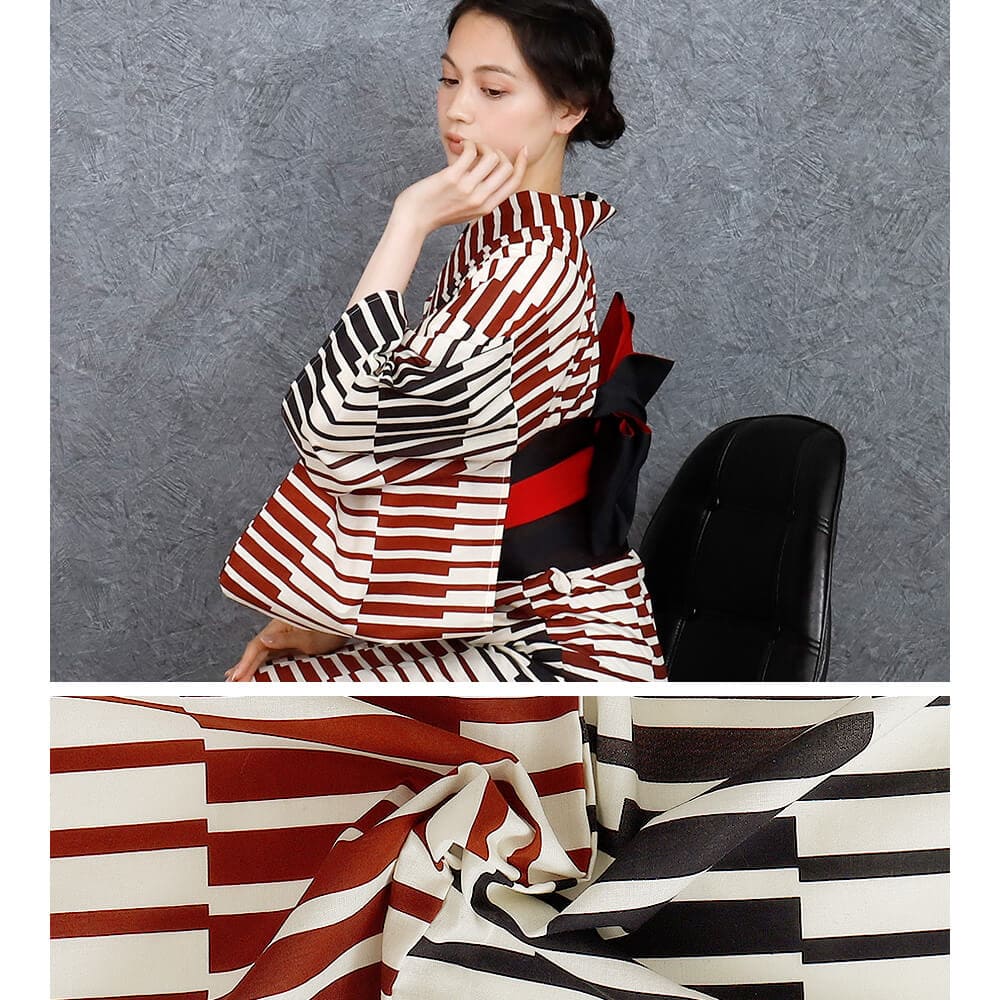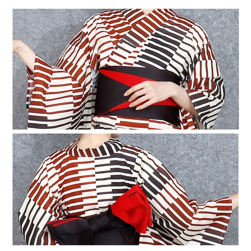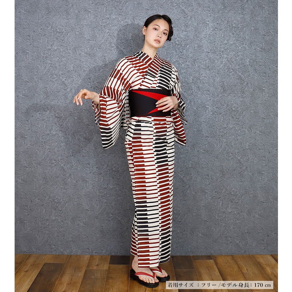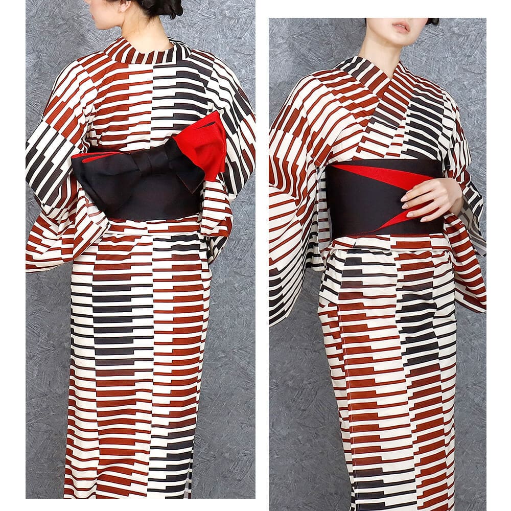 深みのある赤と黒の縞模様が、視覚的にもシャープな印象を与え、帯の合わせ方で印象を自由に変えることができます。