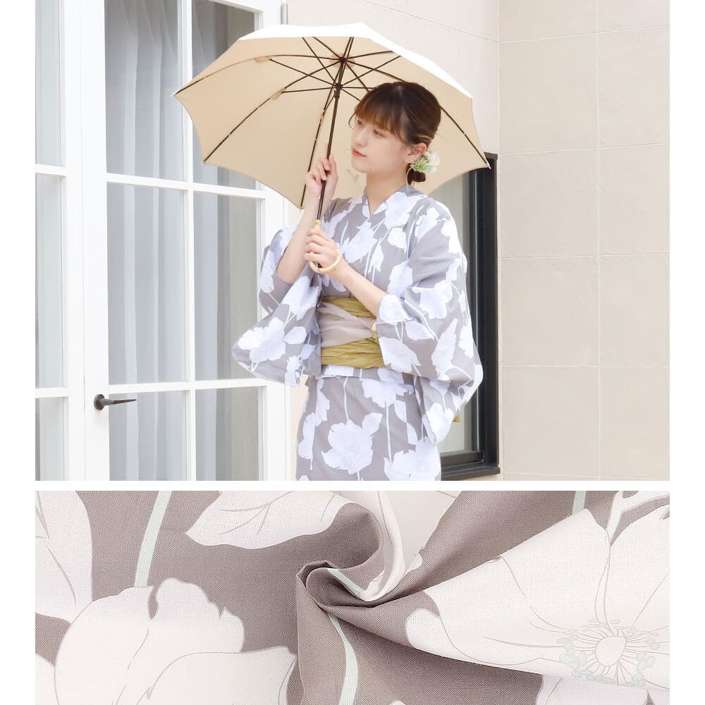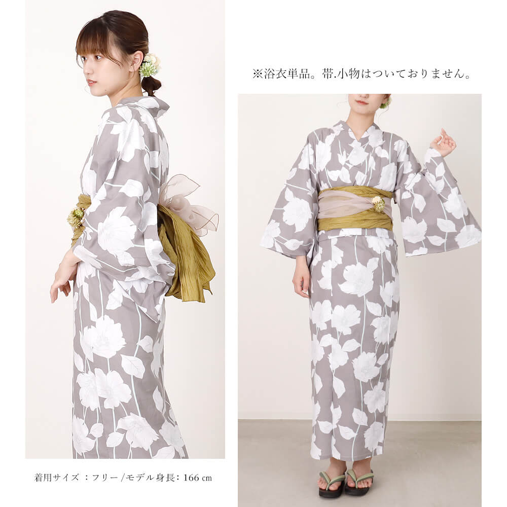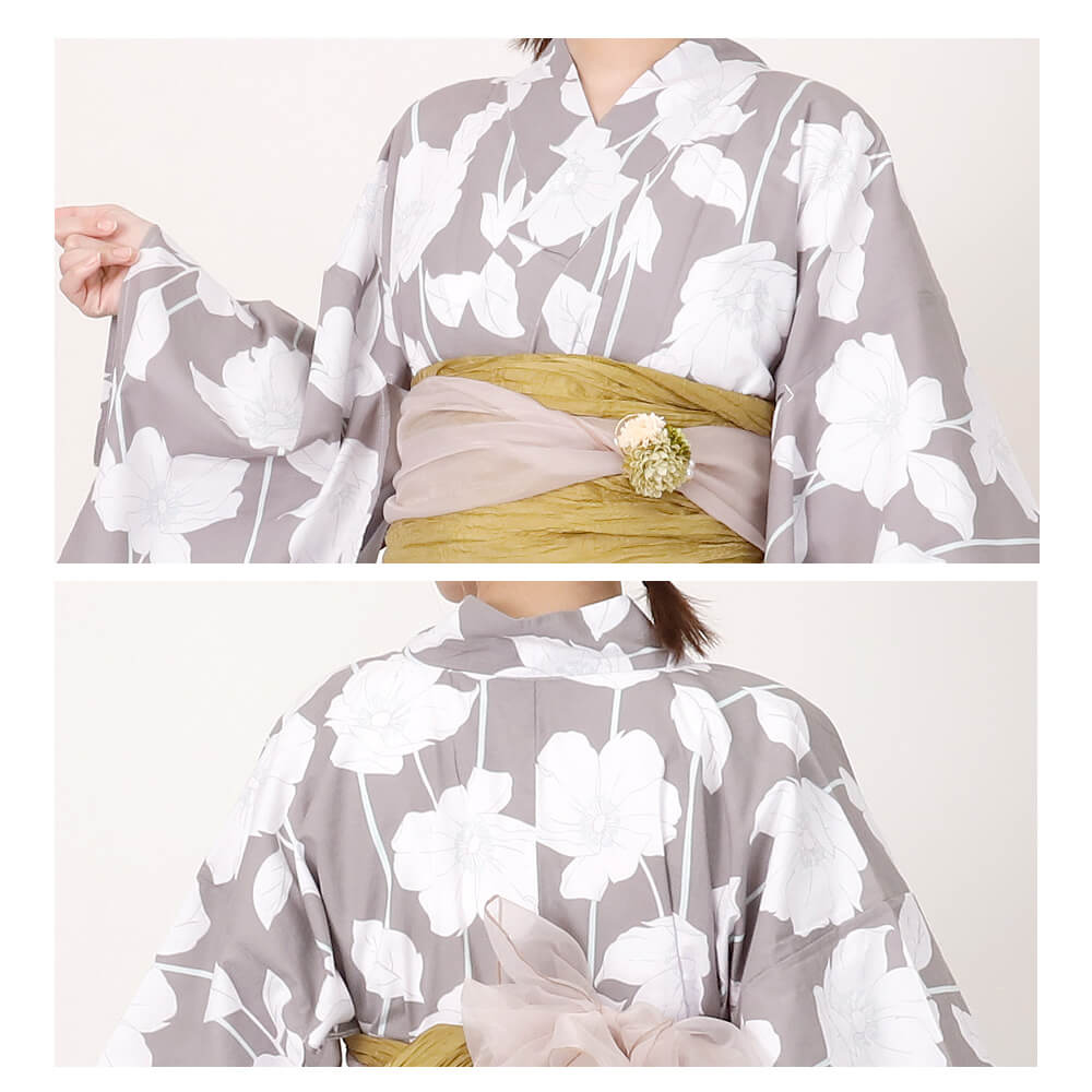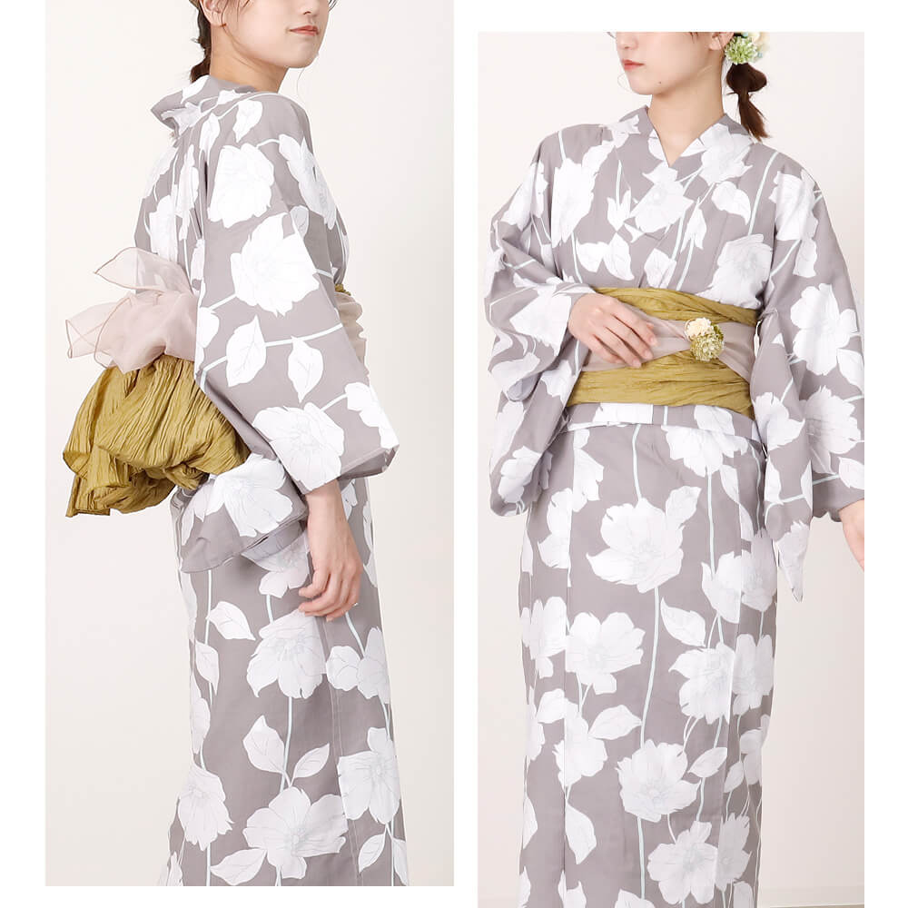 やわらかなグレージュに白椿の花が映える「クラシック椿」柄は、大人の女性にぴったりの落ち着いた印象を与えてくれる浴衣です。