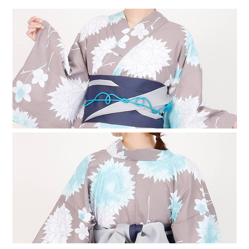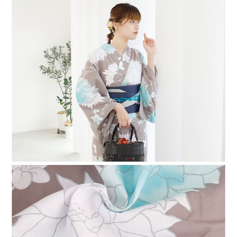 透明感のある淡いブルーと、上品なくすみグレーが見事に調和した「水縹色の水彩花」は、夏の特別な時間に寄り添う一着です。