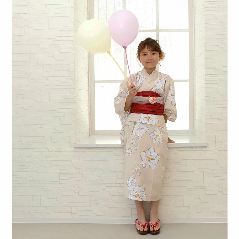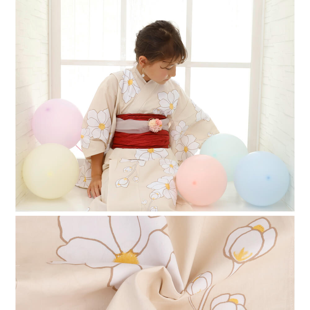 やさしい杏色の地に、白い花がふんわり描かれた「杏色の花蕾」キッズ浴衣は、ナチュラルで上品なデザインが魅力。