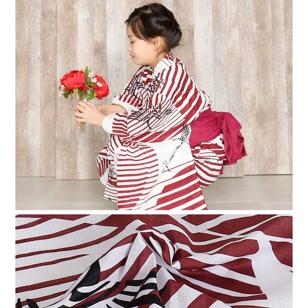 伝統美とモダンが融合!大胆な縞模様と鶴のシルエットが印象的なキッズ浴衣「向かい鶴の舞」は、ちょっと背伸びしたいお子さまにぴったり。