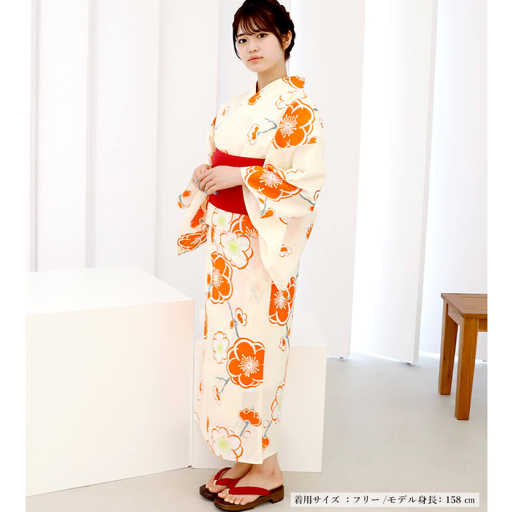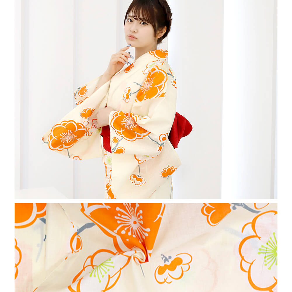 明るく可愛いオレンジの梅の花が目を引く、夏らしい爽やかな浴衣。