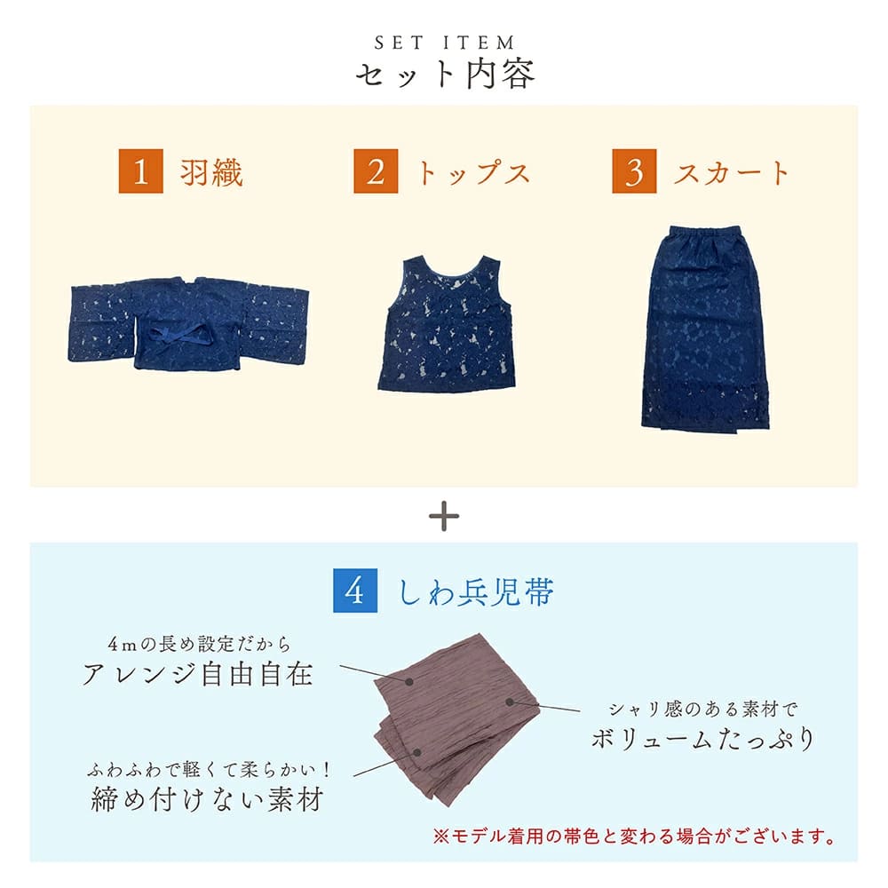 タンクトップ、スカート、羽織り、しわ兵児帯の4点がセットになっており、気分やシーンにあわせて4通りの着こなしが楽しめます。